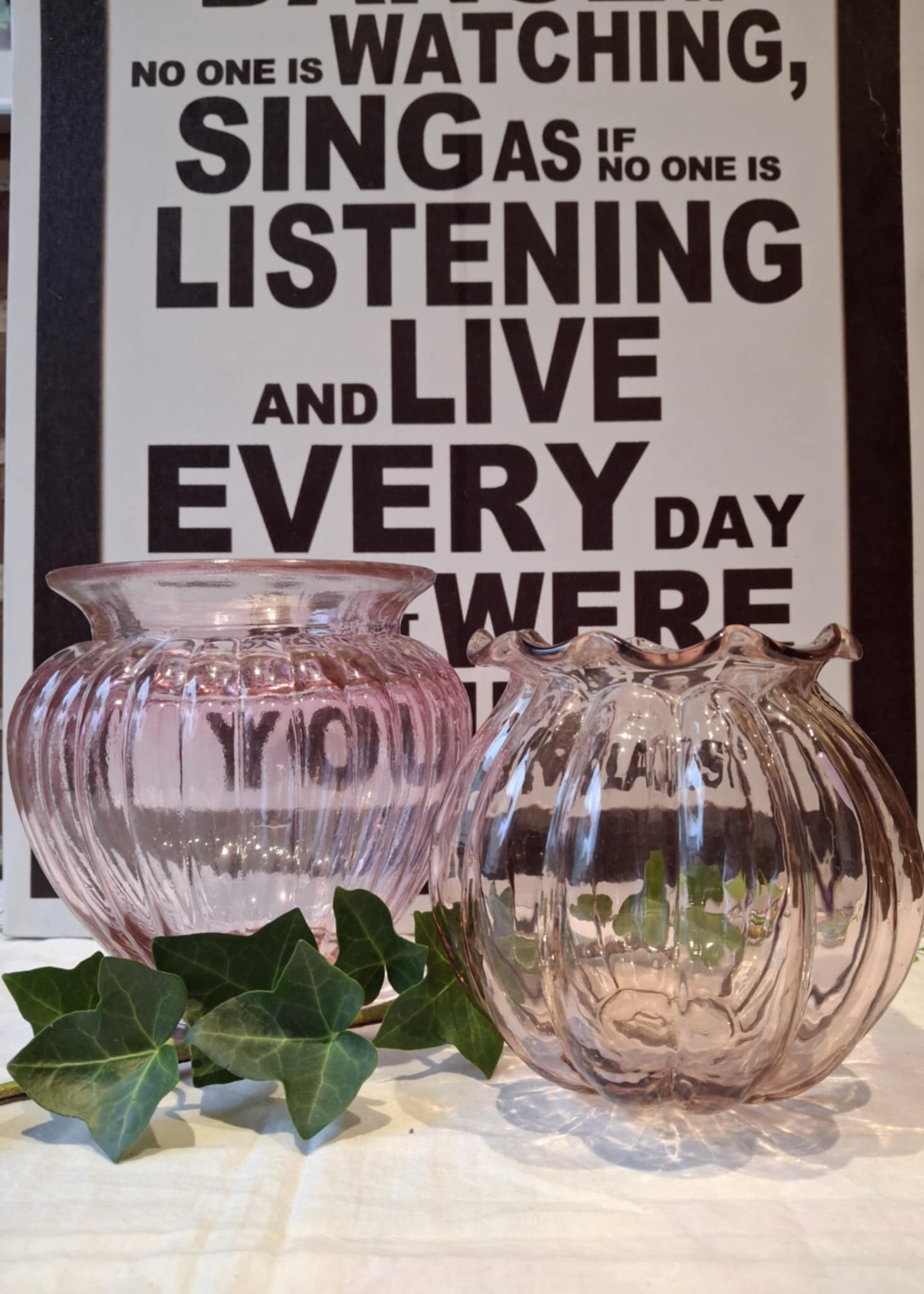 De er sĂĄdan lidt “mormor møder minimalist” – med deres bløde former, riflet glas og sarte rosa nuance, der fanger lyset og kaster et strejf af varme over rummet.
