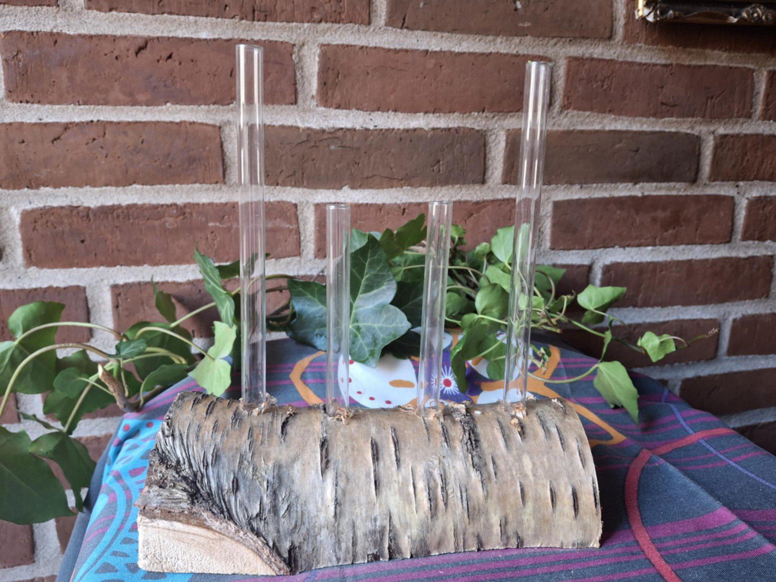 Denne håndlavede trævase med glasrør er skabt af et stykke ægte birketræ – råt, naturligt og fuld af liv.