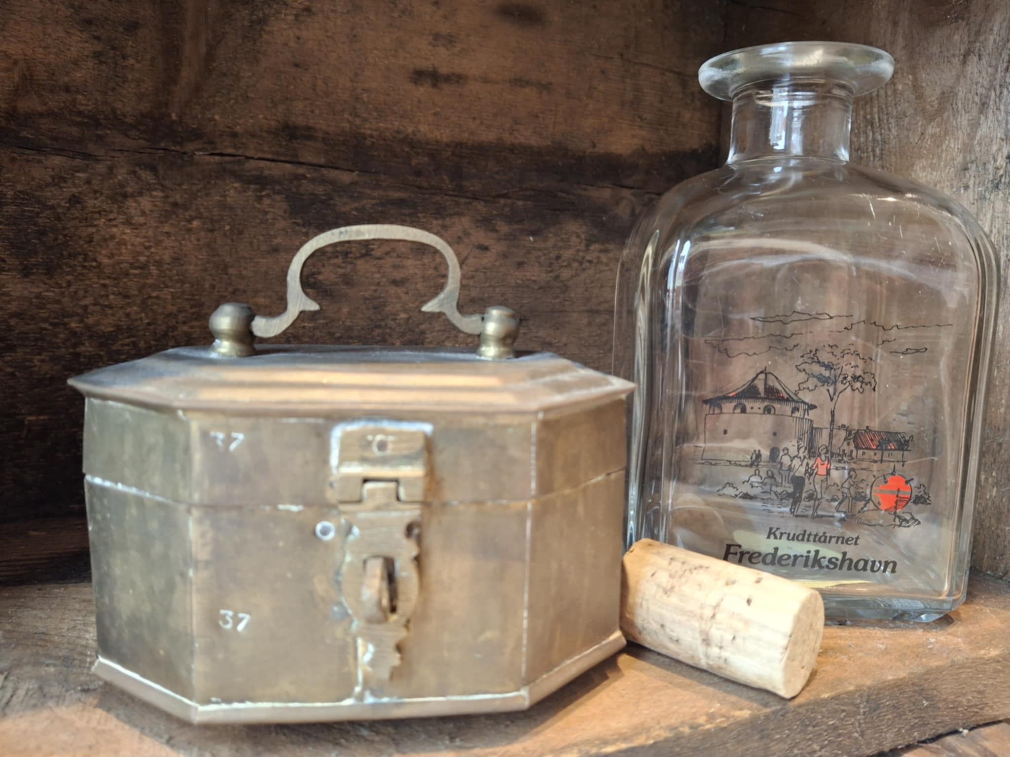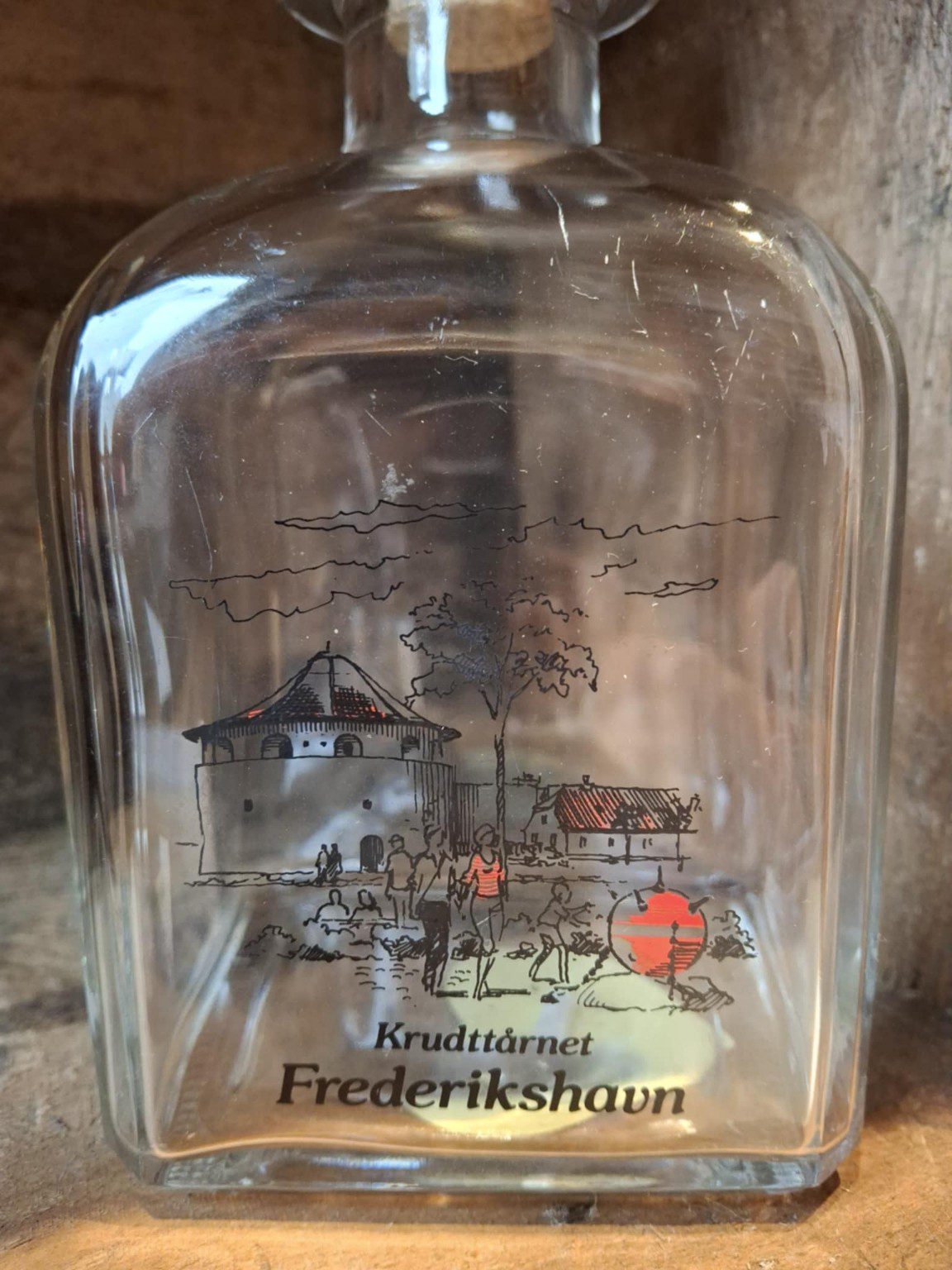 Denne fine, firkantede glasflaske bærer et trykt motiv af Krudttårnet i Frederikshavn, et af byens mest elskede vartegn.