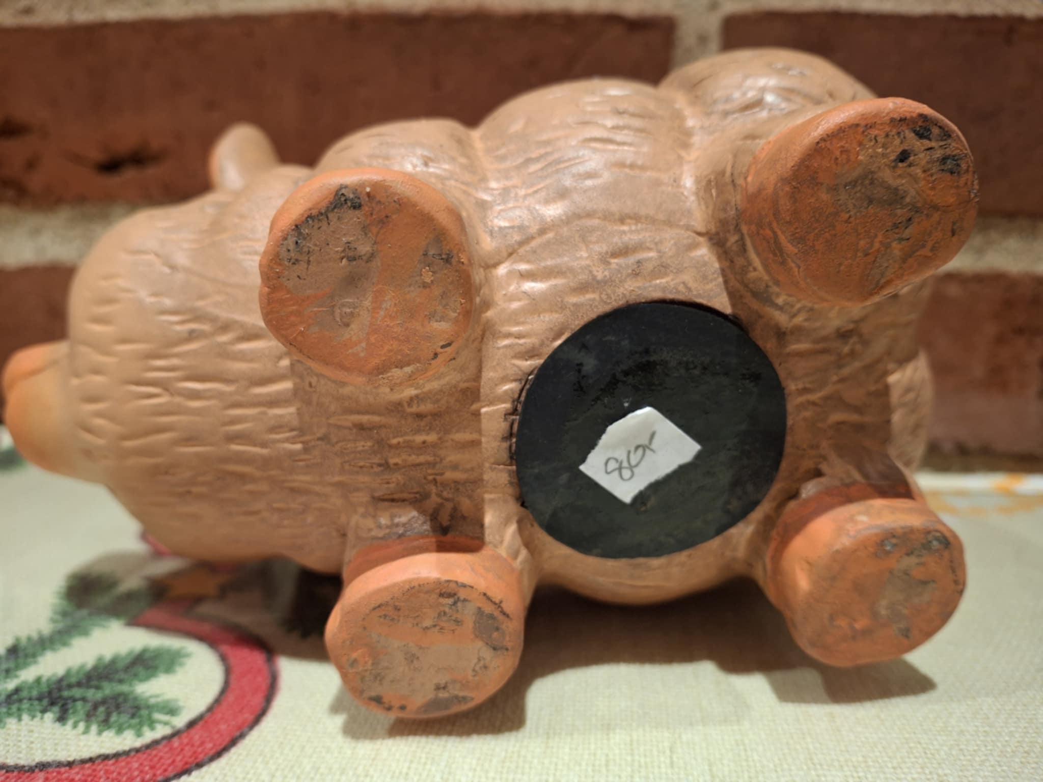 Denne skønne julegris er formet i solid, gammeldags sparegris-stil med fine håndmalede detaljer: store nysgerrige øjne, blød rødlig snude og en lille krøllet hale, der får enhver til at smile. Den har allerede levet et godt liv og bærer smukke, naturlige patina-spor – lige præcis som mormor elsker det: ting med historie er ting med hjerte.
