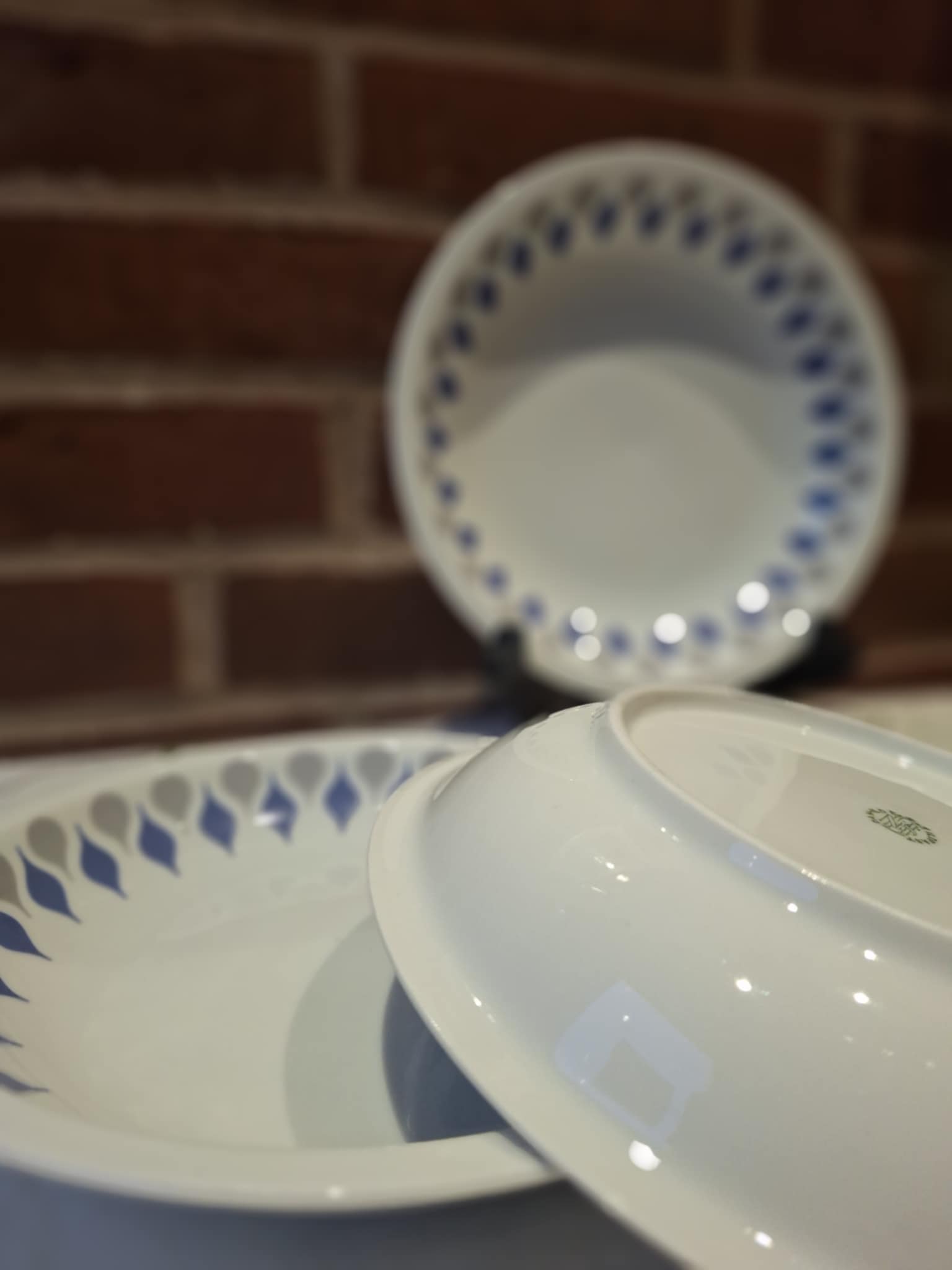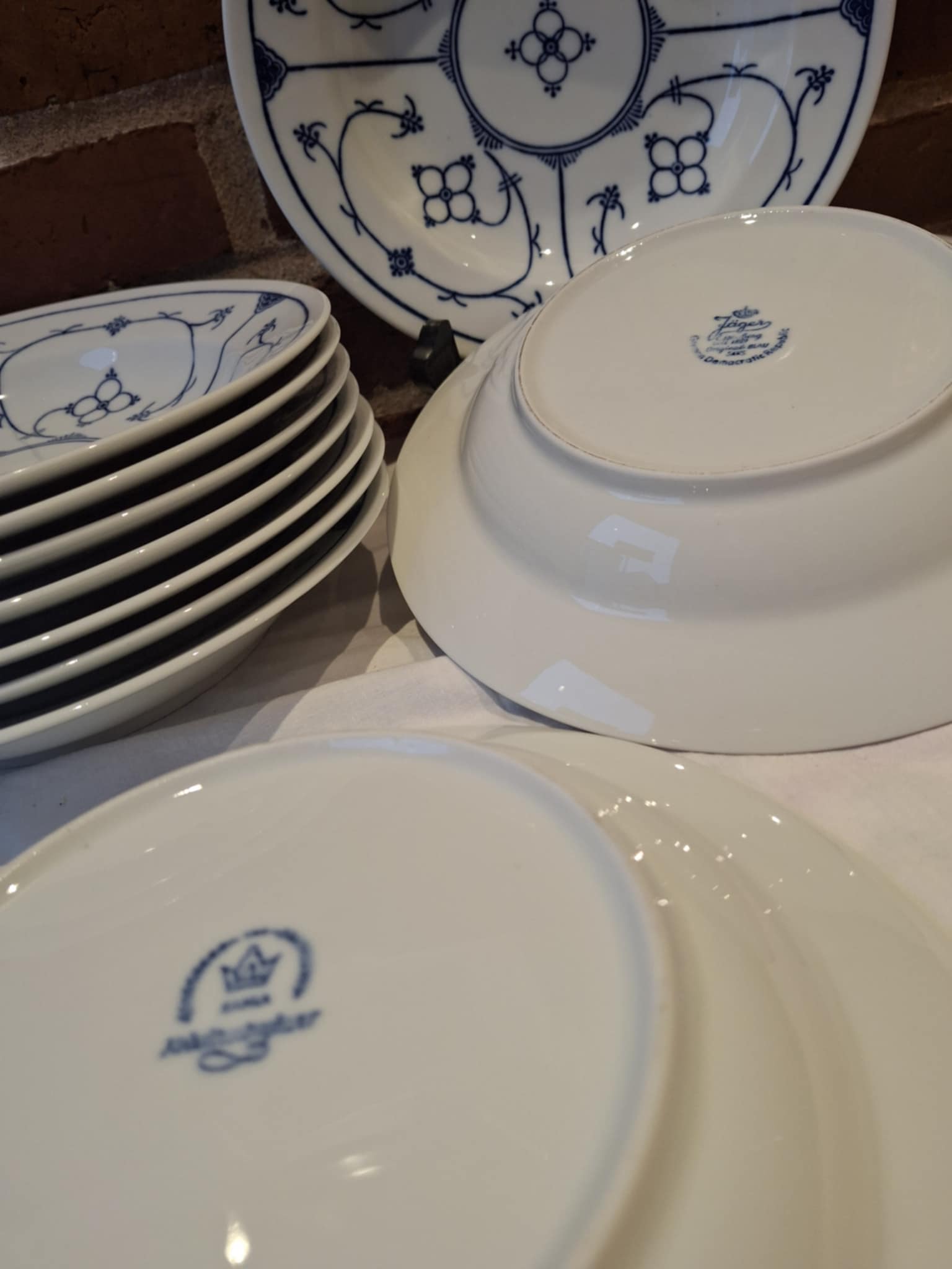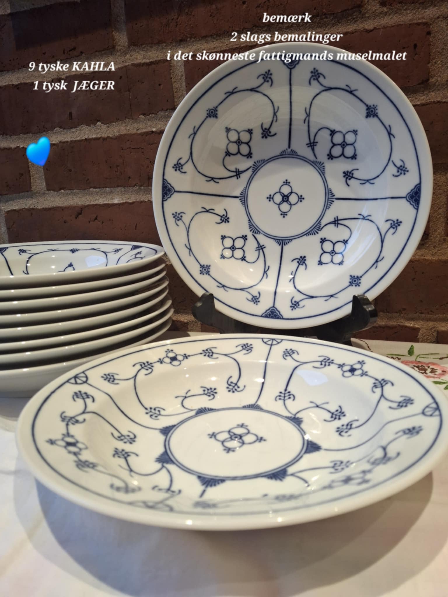 9 er fra tyske Kahla og 1 fra Jäger, og tilsammen danner de et harmonisk og charmerende sæt med små variationer i bemaling og blåtoner – præcis som man elsker det, når porcelænet har levet et langt og kærligt liv.