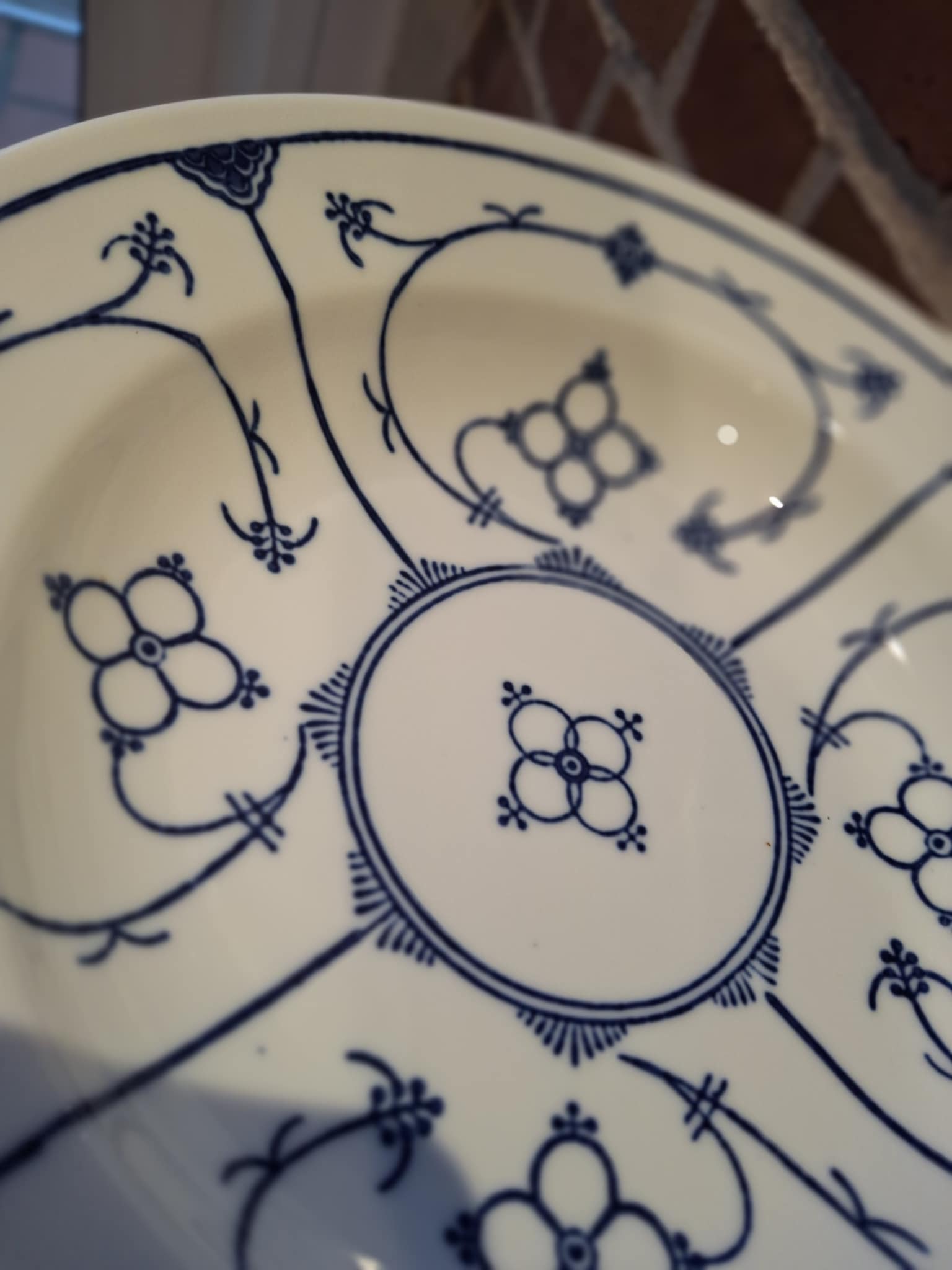 Dette sæt med 10 dybe tallerkener i det klassiske blå fattigmands-muselmalet mønster er lige præcis sådan et fund.