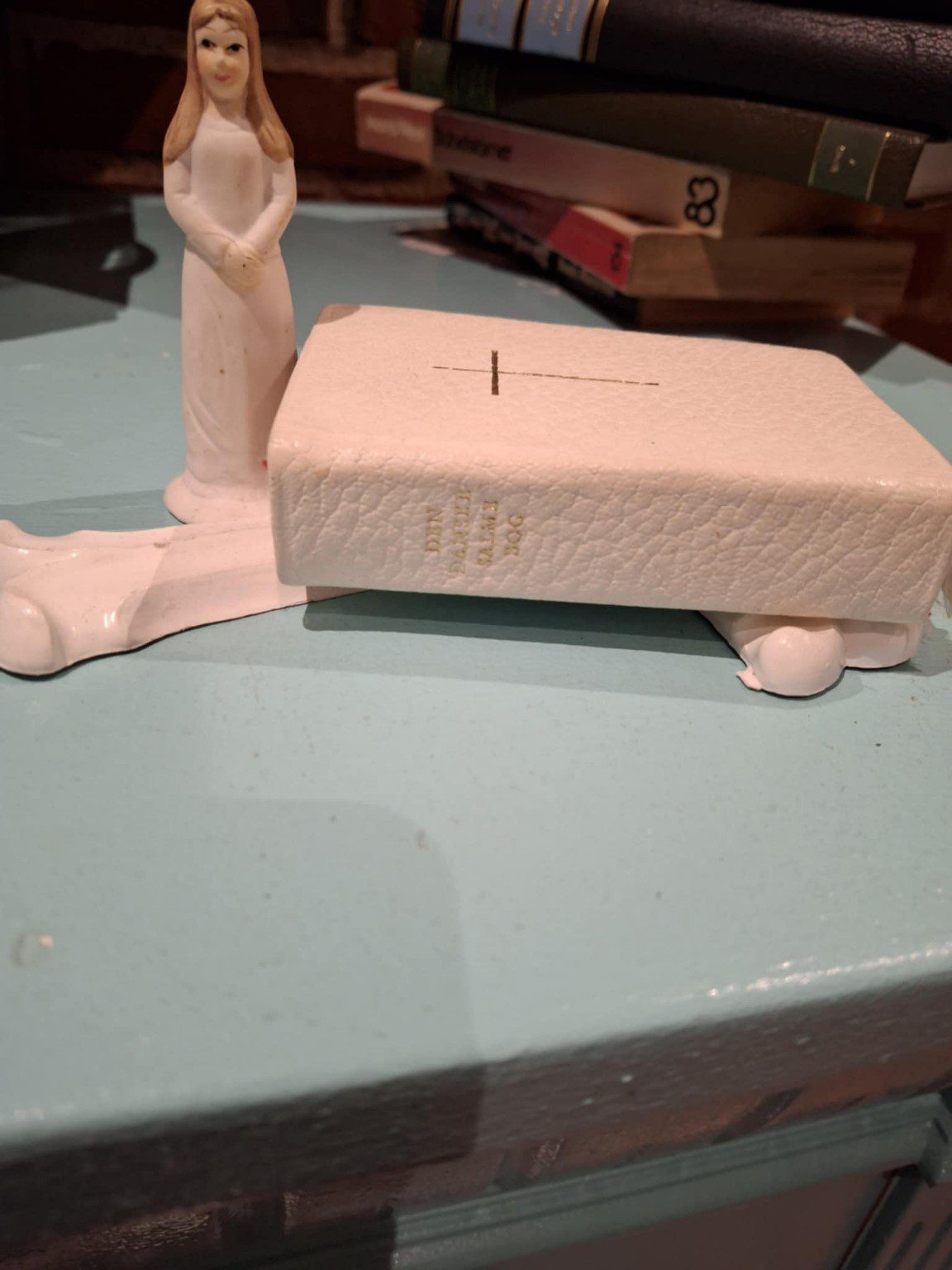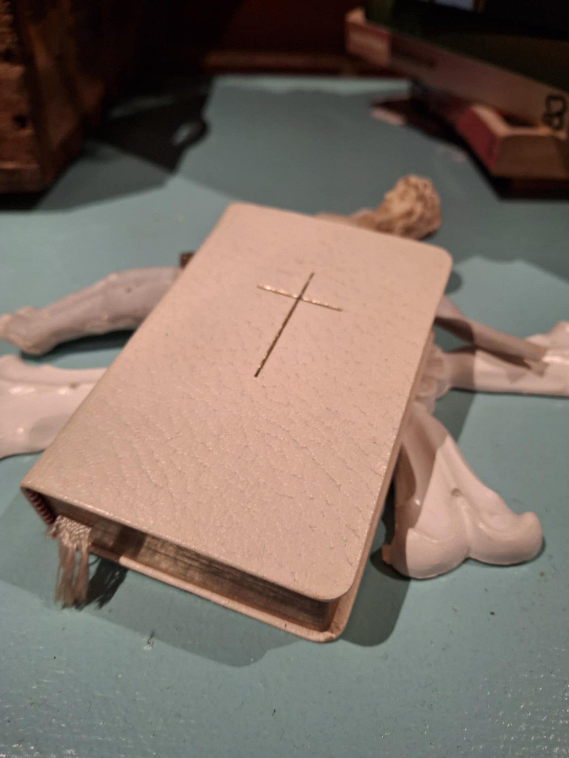 Bind: Hvidt kunstlæder med guldkors (beskyttende overtræk), sort originalbind indeni