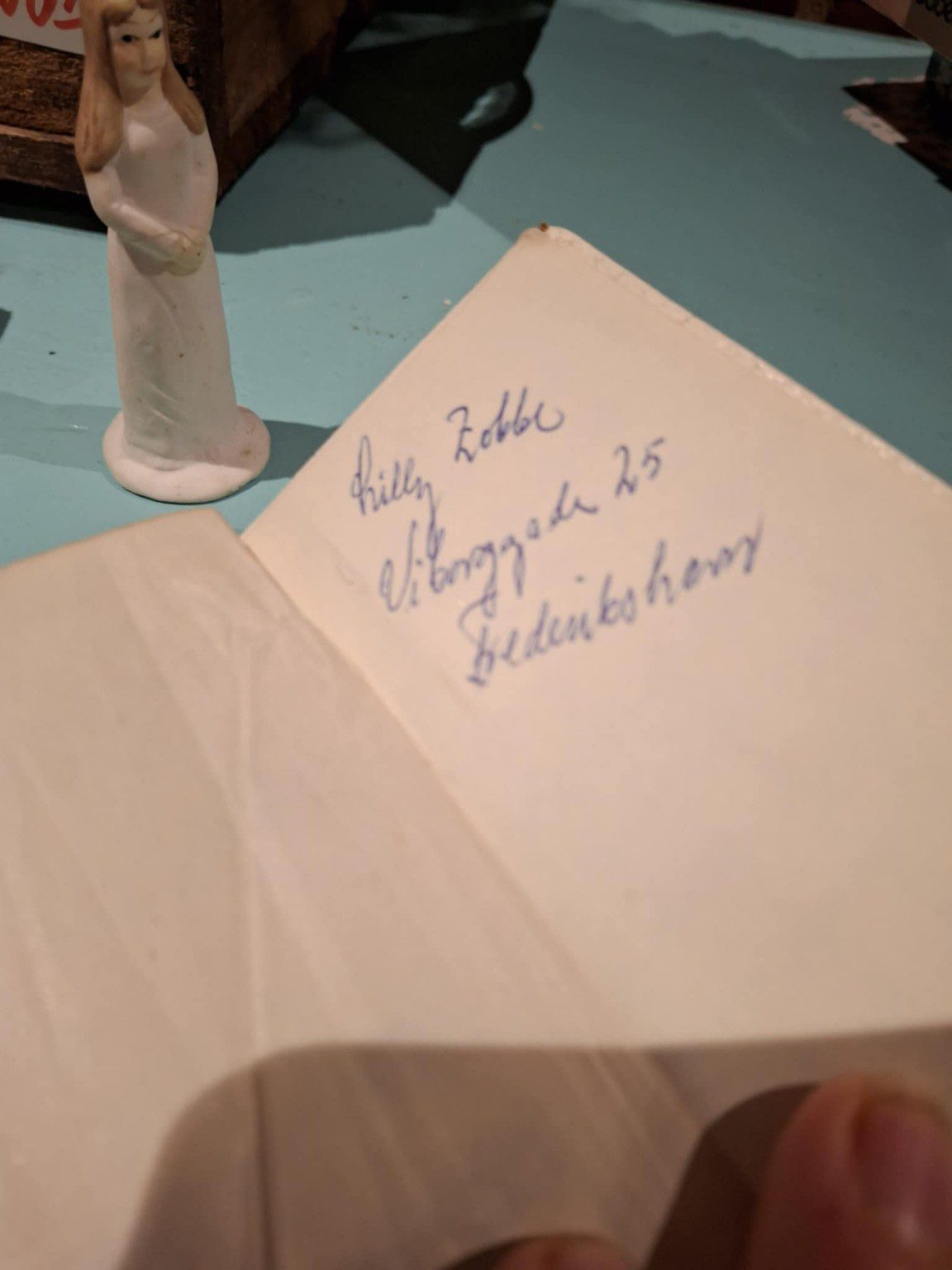 Inde i bogen finder man en personlig hilsen med tidligere ejers navn og adresse – et stykke autentisk historie, der tilføjer ekstra charme og fortæller om bogens rejse gennem tiden.