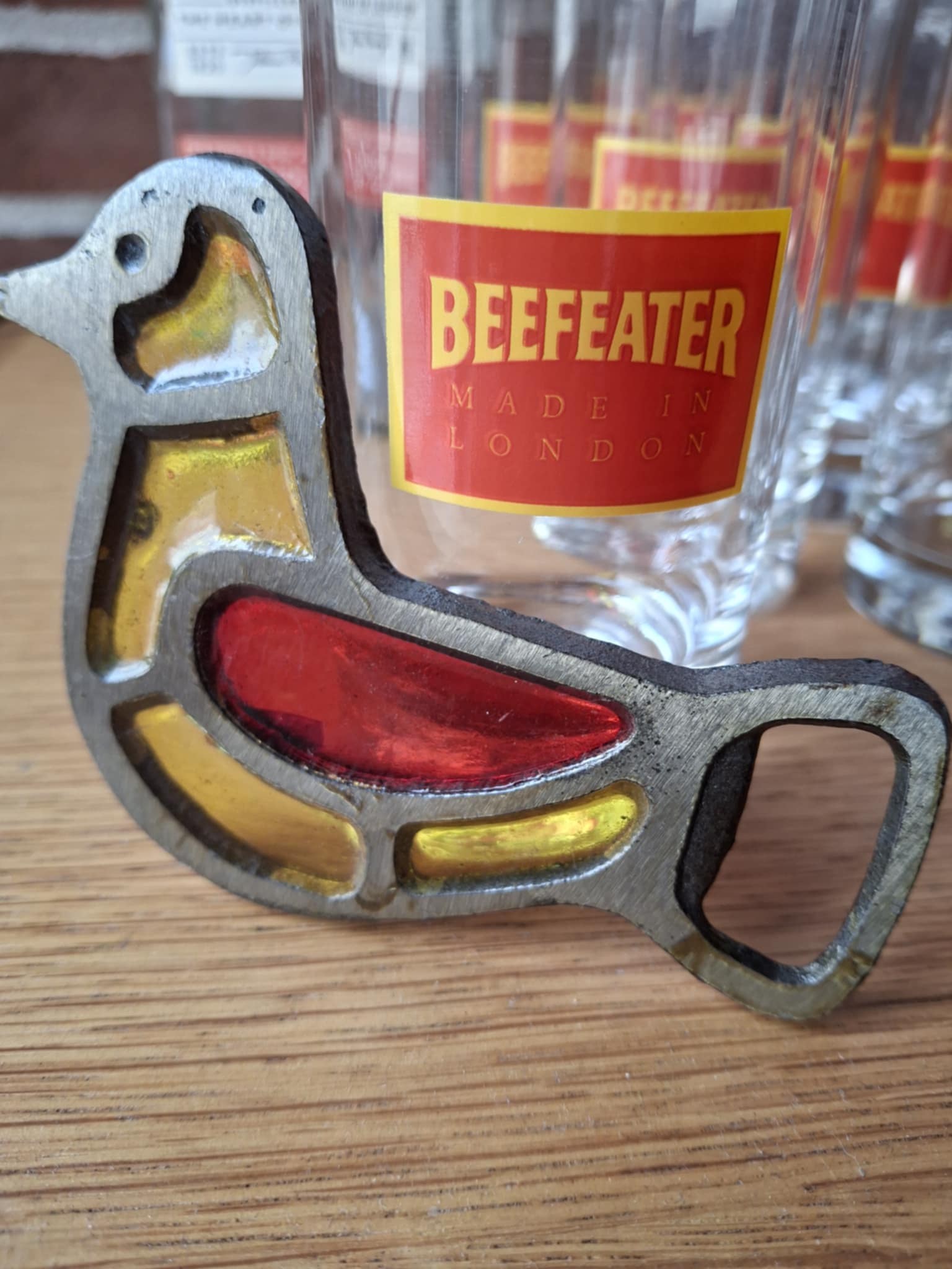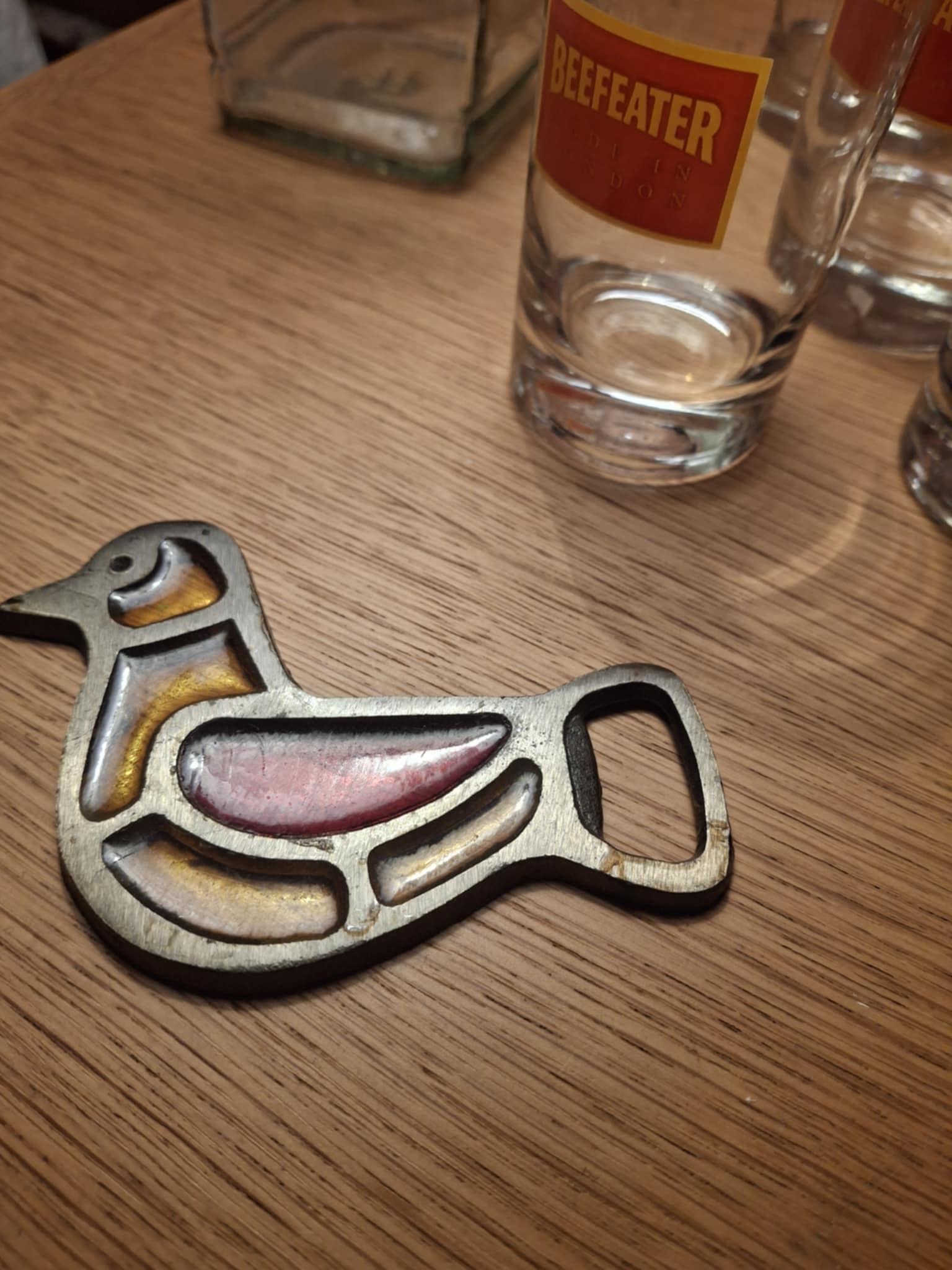 Vintage flaskeåbner i metal og farvet glasemalje