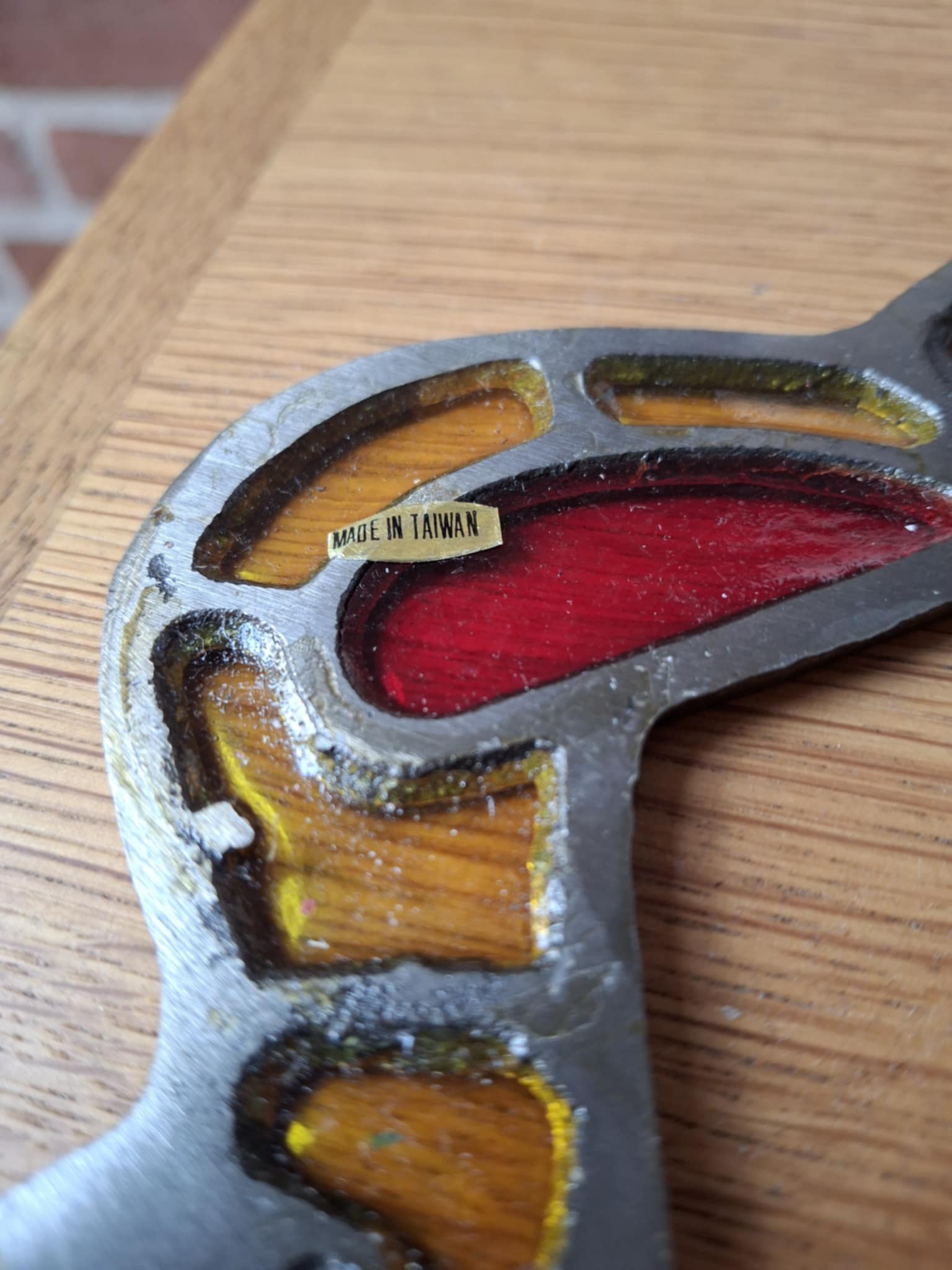 En tung, solid vintage oplukker formet som en fugl, med farvet glasemalje i gyldne og røde nuancer.