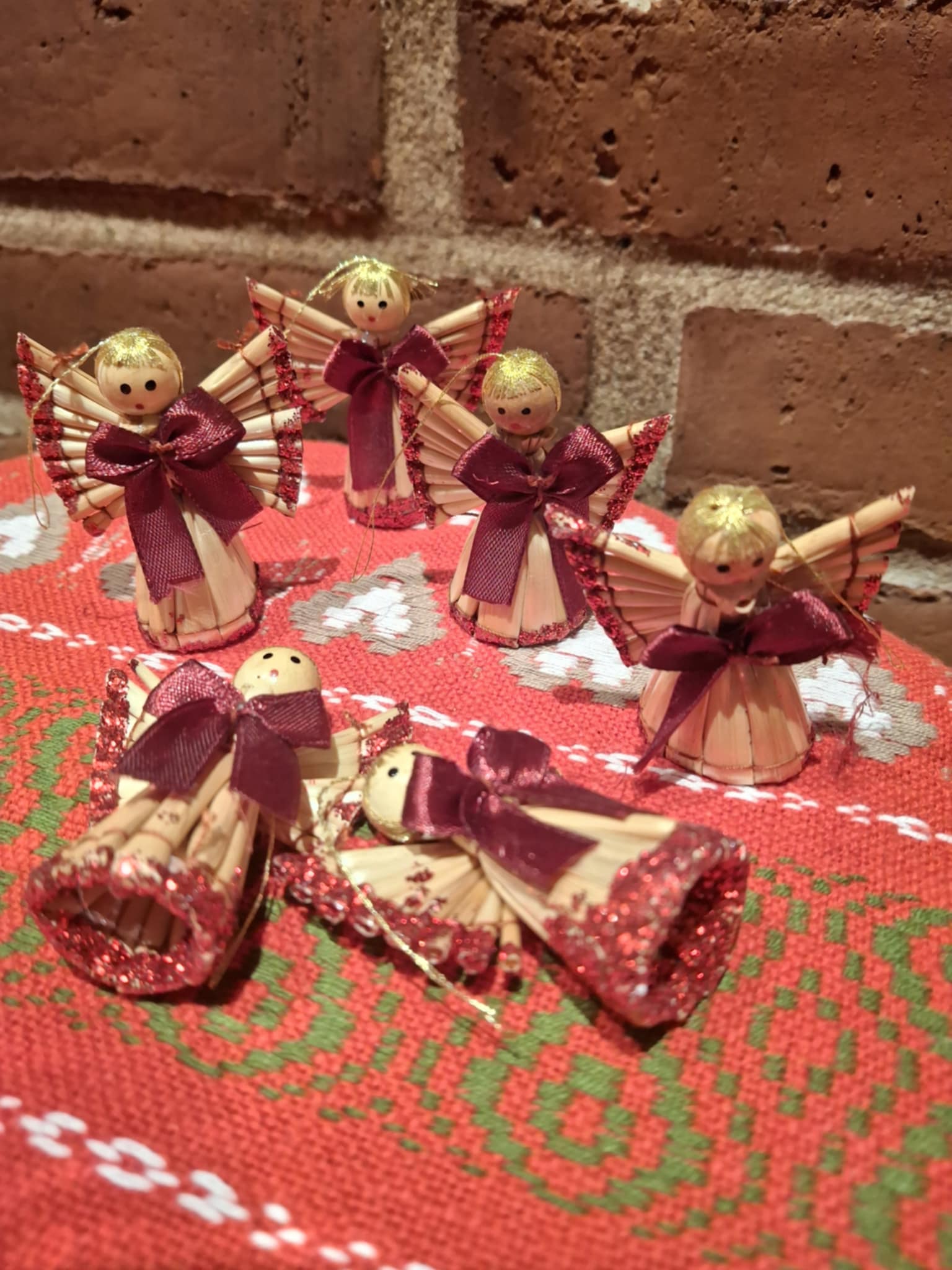 Englene er håndlavede i lyst rattanstrå, pyntet med smukke bordeaux sløjfer og drysset med rødt juleglimmer langs kjolekanten. Hver enkel har sit eget lille udtryk – nogle står ranke og synger julens salmer, andre ligger pynteligt og venter på at blive hængt op. Tilsammen giver de et udtryk af hygge, tradition og håndlavet kærlighed til julen.