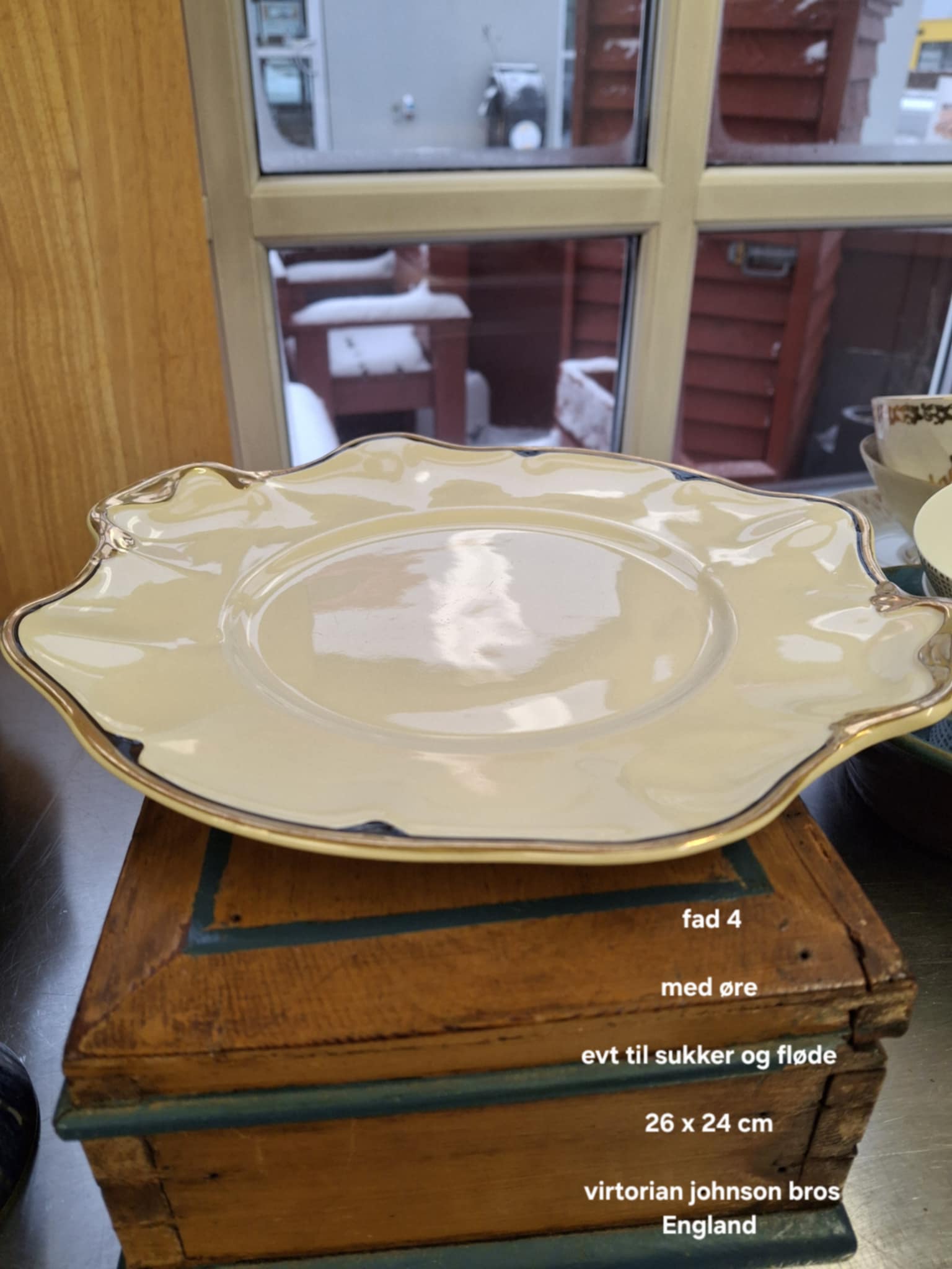 Sikke et charmerende, antikt fad! Med sin smukke cremefarve og de fine guldkanter oser det af svundne tider og hyggelige stunder. Den bølgede kant med “ører” giver det et helt særligt udseende, som bare venter på at pynte på kaffebordet.
