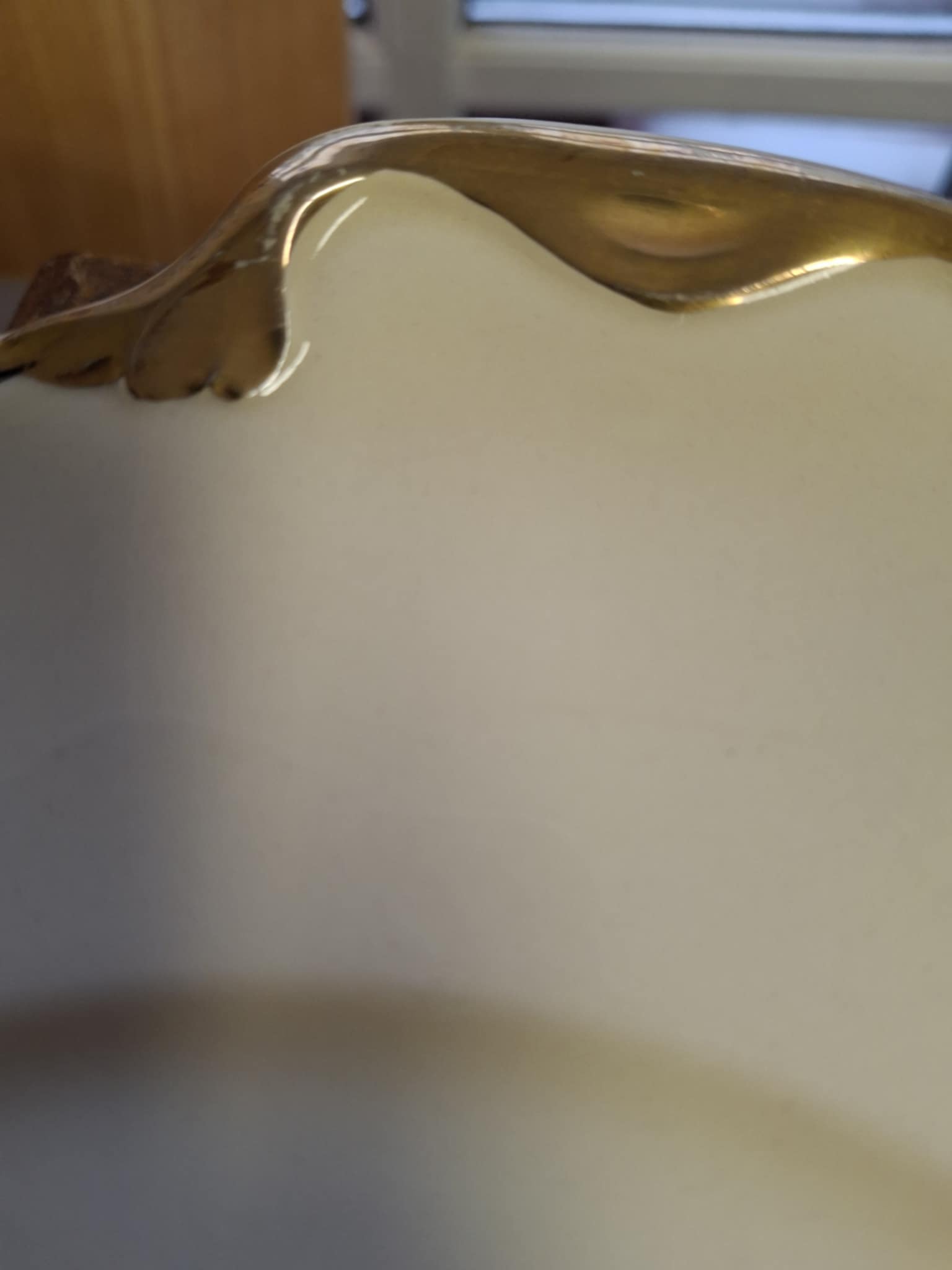 Lad os kigge nærmere på detaljerne, som billederne så fint viser os. Fadet er udført i en blød, varm cremefarvet nuance, der smukt fremhæver de gyldne, bølgende kanter. Denne guldkant er ikke bare en tynd streg, men en fyldig, detaljeret dekoration, der giver fadet en luksuriøs og festlig følelse. De små ‘ører’, som sidder på kanterne (som vi ser tydeligt på det første billede), tilføjer et elegant og unikt touch, der skiller fadet ud fra de mere almindelige af slagsen. På billede to kan man se guldets glans og de bløde overgange på kanten – et vidnesbyrd om den gode, bevarede stand.