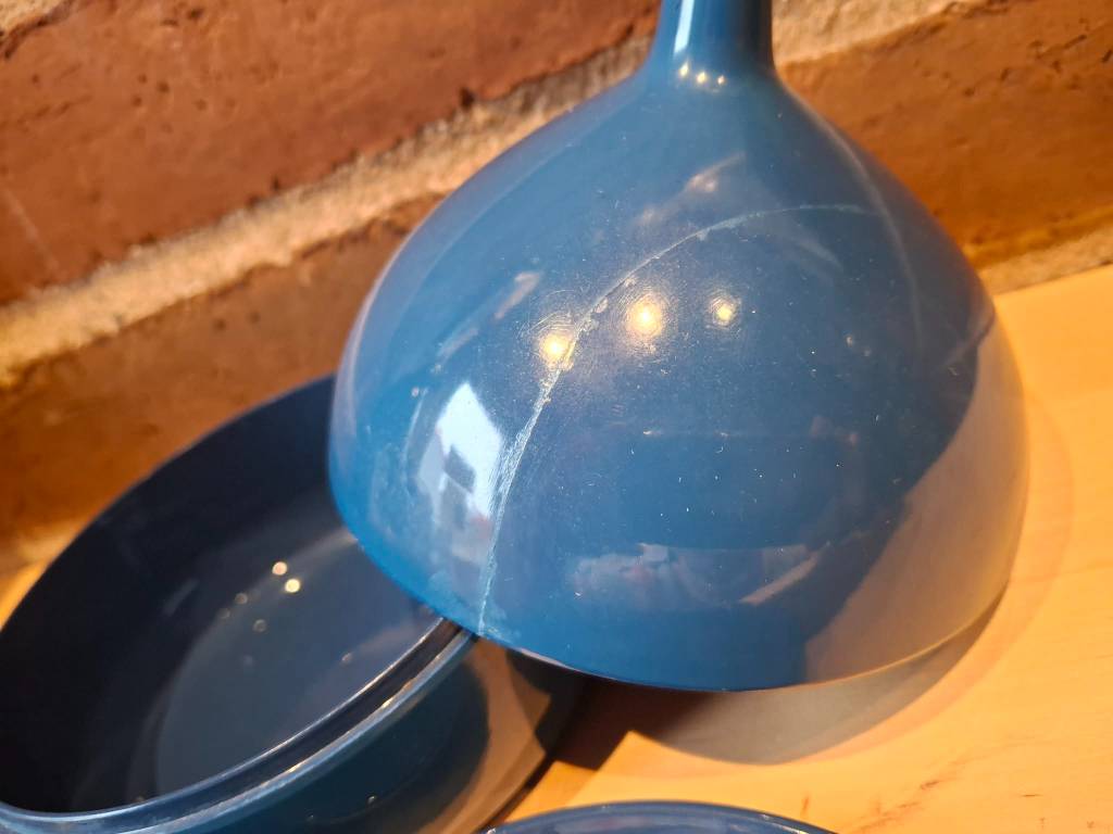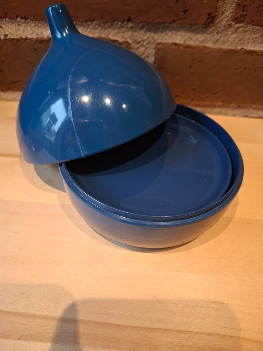 Bring et strejf af nostalgi og funktionalitet ind i dit køkken med denne smukke blå beholder med 4 matchende bordskånere. Beholderen har en elegant, rund form med låg og en dyb blå farve, der emmer af retrocharme. Bordskånerne passer perfekt ned i beholderen og gør det let at holde styr på dem.