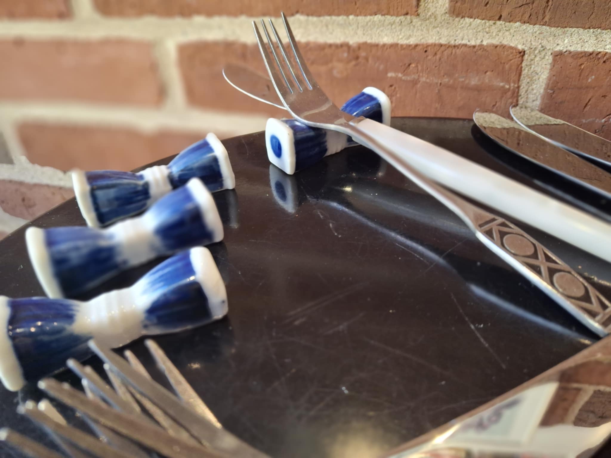 Smuk og klassisk lille porcelænsholder i håndmalet blå-hvid stil – perfekt til at holde dine smørknive eller spisepinde pænt på plads ved borddækningen.