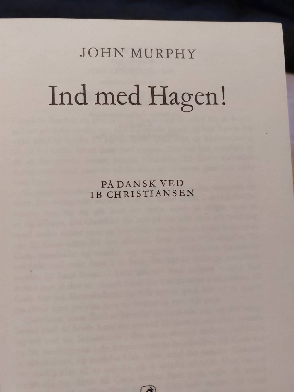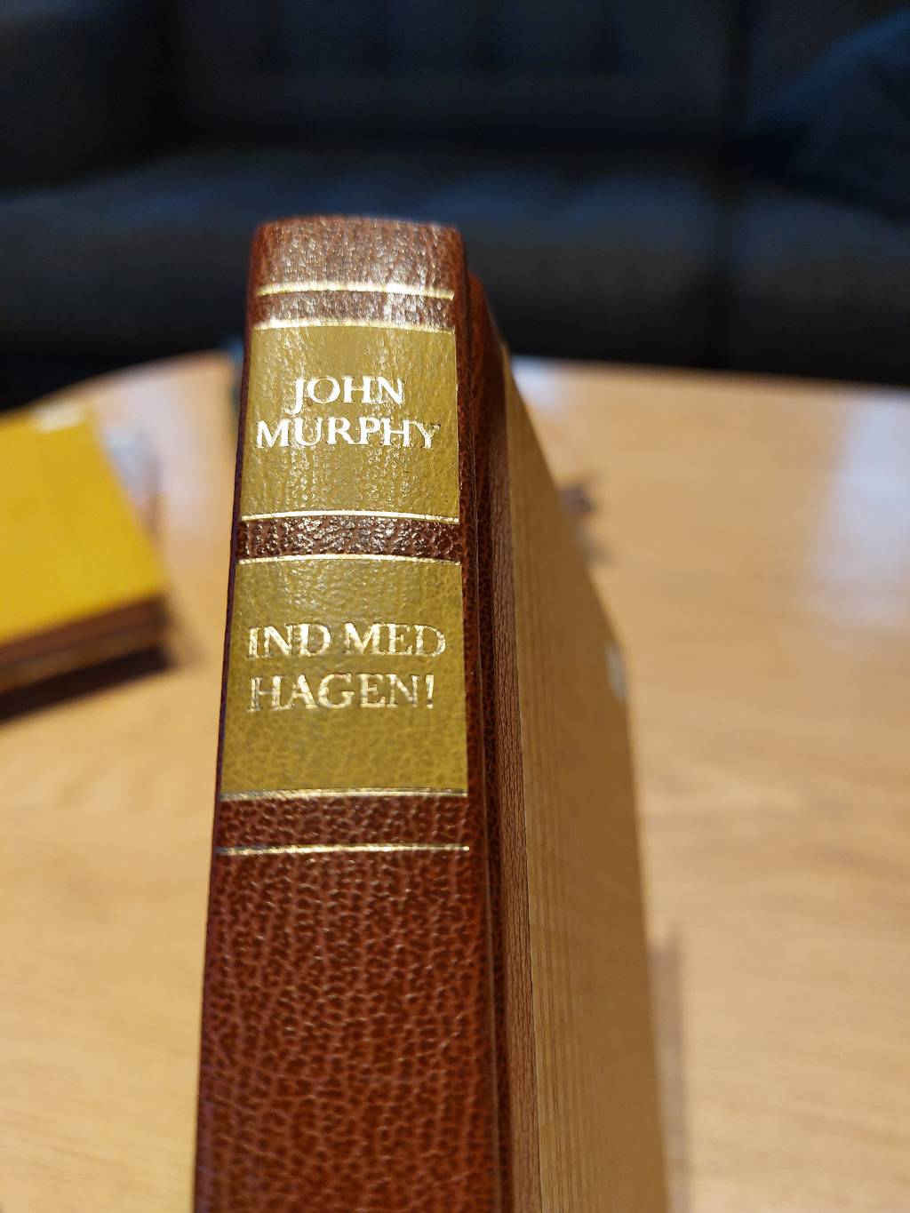 Ah, minderne! Denne herlige udgave af “Ind med Hagen!” af John Murphy er en sand tidslomme. Bogen har et flot, tekstureret brunt bind, der leder tankerne hen på gode, gamle dage og solide håndværk. På ryggen finder man forfatterens navn, JOHN MURPHY, og titlen, IND MED HAGEN!, smukt præget i guld, omkranset af fine, lige guldlinjer.