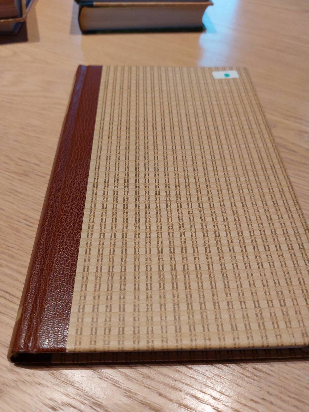 Kigger man på bogens forside, ser man et charmerende stribet mønster i lysebrune og cremefarvede nuancer, der giver bogen et let og klassisk udtryk. Der er en lille blå mærkat på forsiden, som blot bidrager til dens unikke historie. Trods sine år, fremstår bogen i god og velholdt stand – klar til at bringe glæde til sin næste ejer.