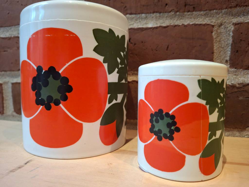 Dette smukke dåsesæt fra Lønborg bringer et strejf af retro hygge med sit iøjnefaldende design. De orange og røde blomster med grønne blade lyser op i ethvert køkken og skaber en varm og indbydende stemning. 🌿
