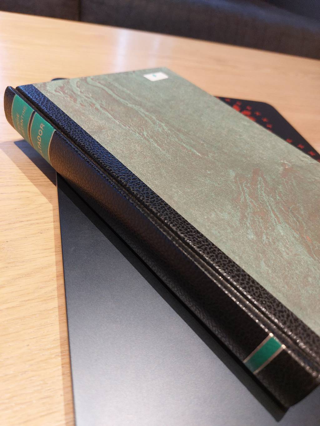 Bogen præsenterer sig smukt med en læderryg i mørk struktur og grønne detaljer med guldbogstaver. Omslaget har et marmoreret mønster i grønne nuancer, der tilføjer en sofistikeret charme. Perfekt til at pryde bogreolen eller som en del af en hyggelig læsekrog.