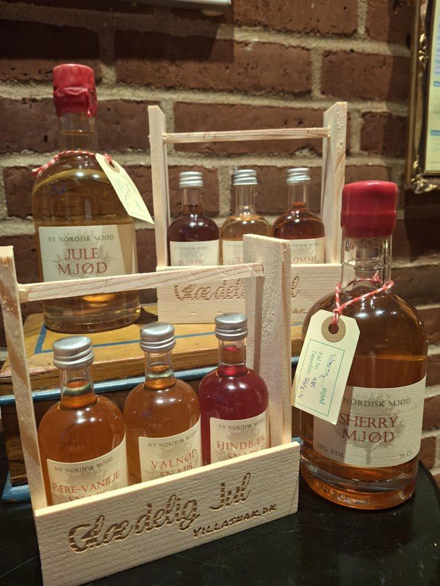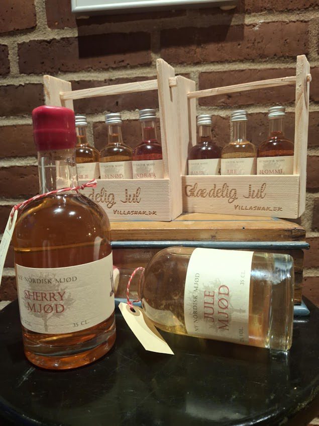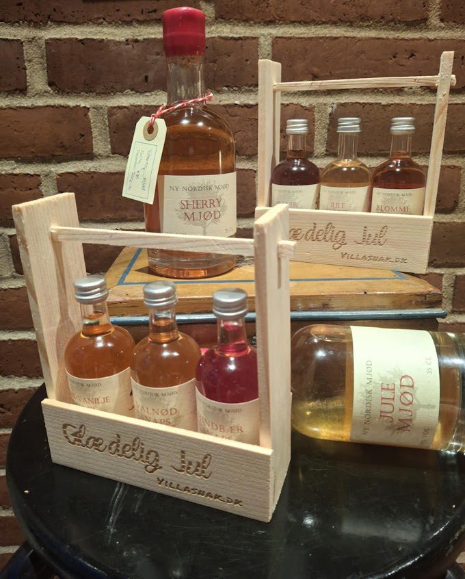 Hver kurv rummer 3 små flasker à 5 cl fra Ny Nordisk Mjød – håndbrygget på nordiske råvarer og masser af kærlighed.