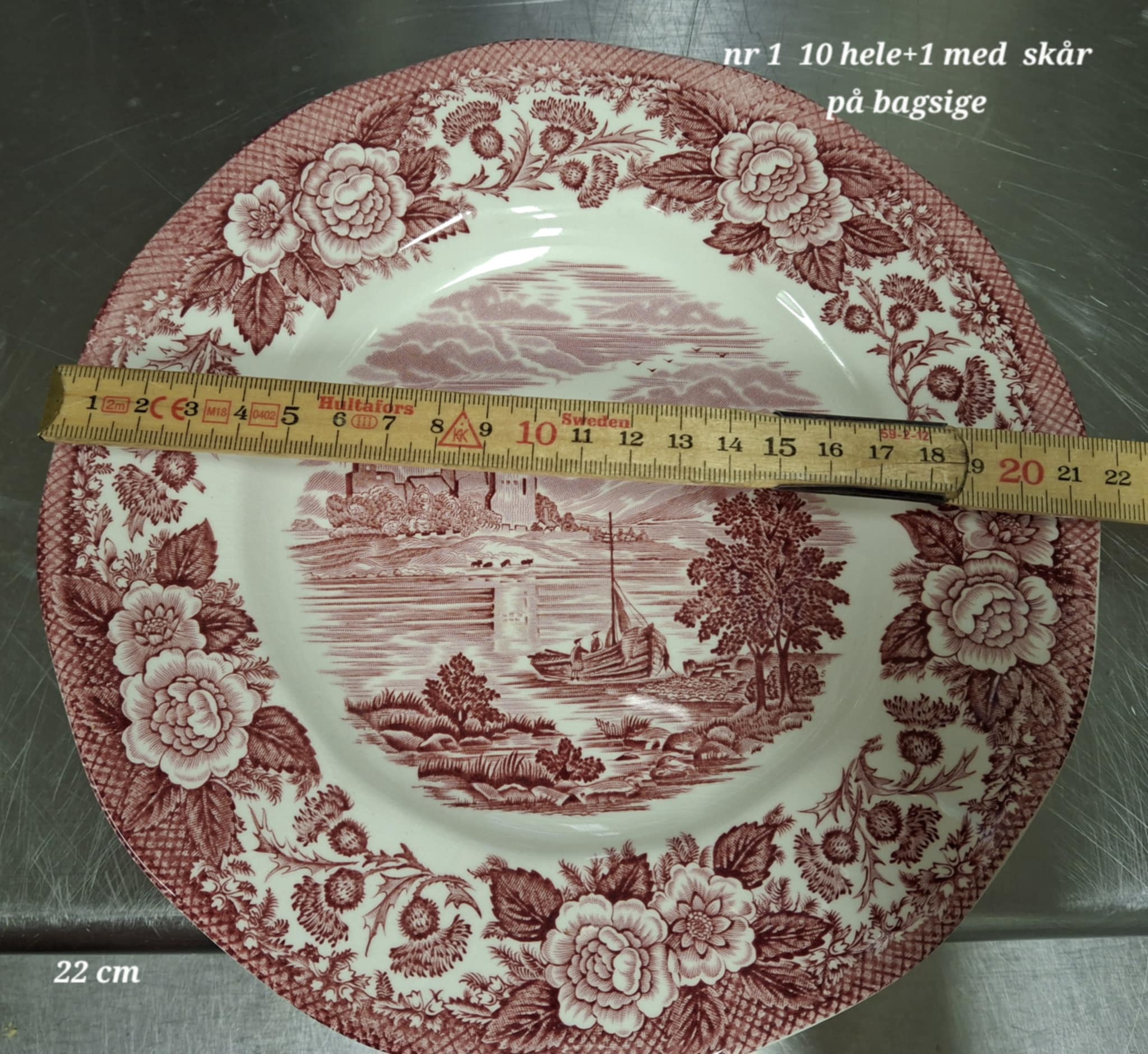 Dekor: Rødt transferware – borg, sø og blomsterbort