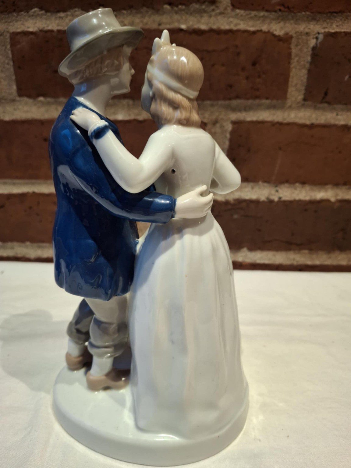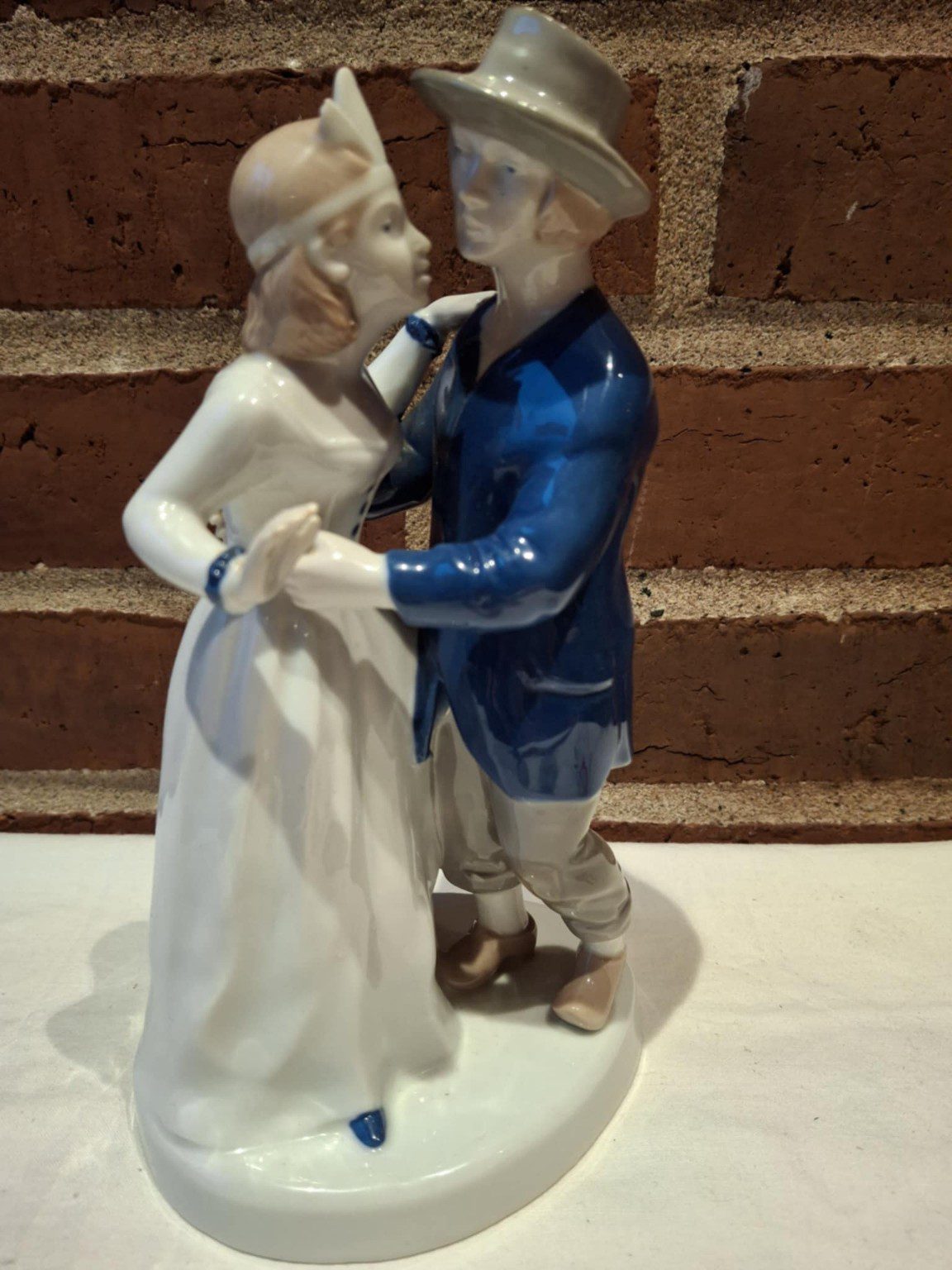 Denne smukke figur viser et ungt par i folkedragt, der danser tæt – han i blå jakke og hat, hun i hvid kjole med blå detaljer. Figuren er udført med en sjælden lethed og bevægelse, som om musikken stadig spiller.