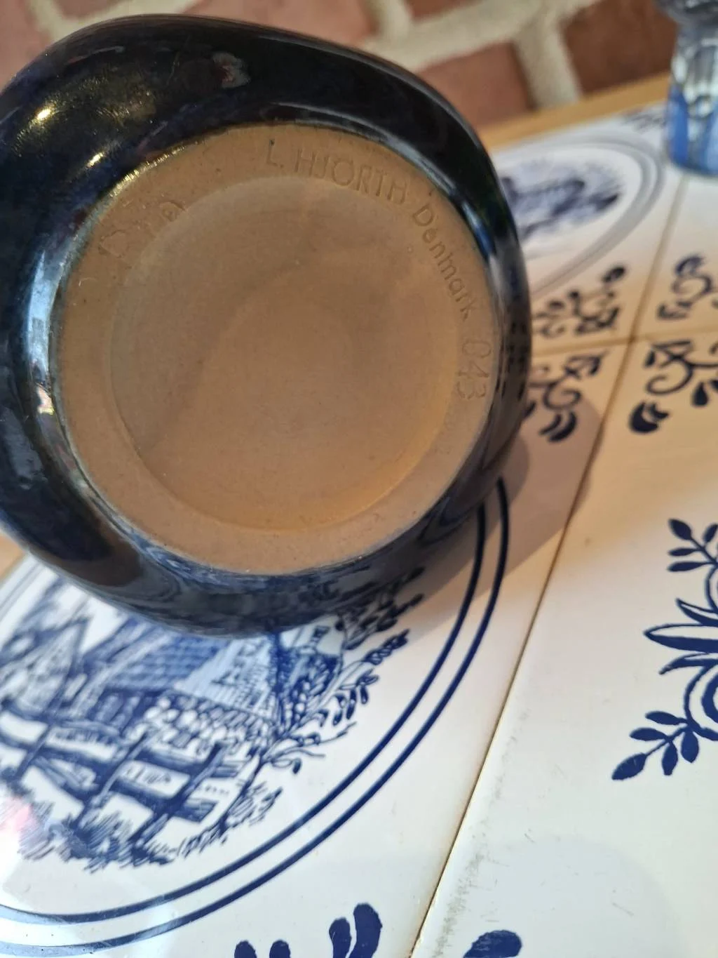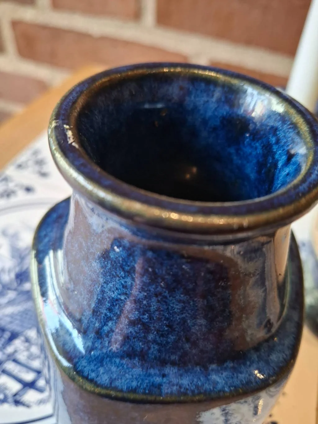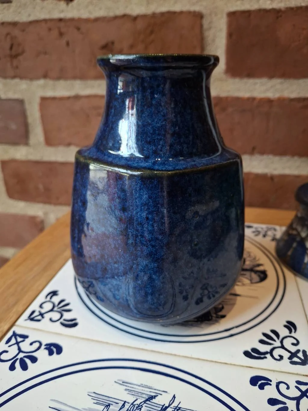 En smuk femkantet vase i dyb blå glasur fra L. Hjorth 🌿. Perfekt som pynteting med en lille chip, der fortæller sin egen historie 💫.