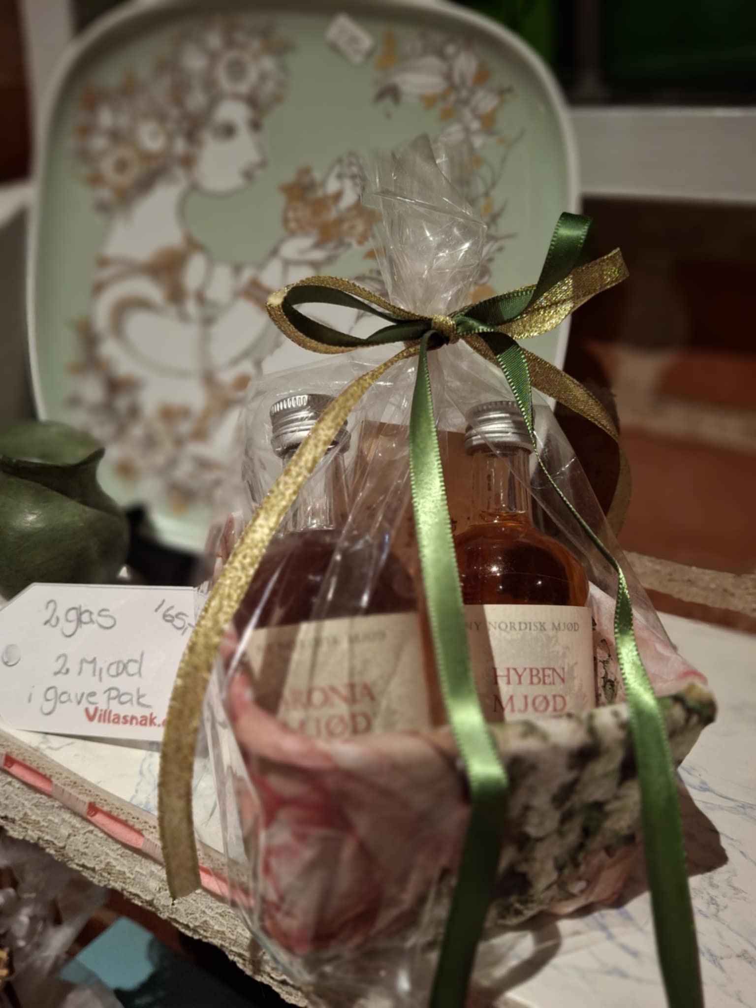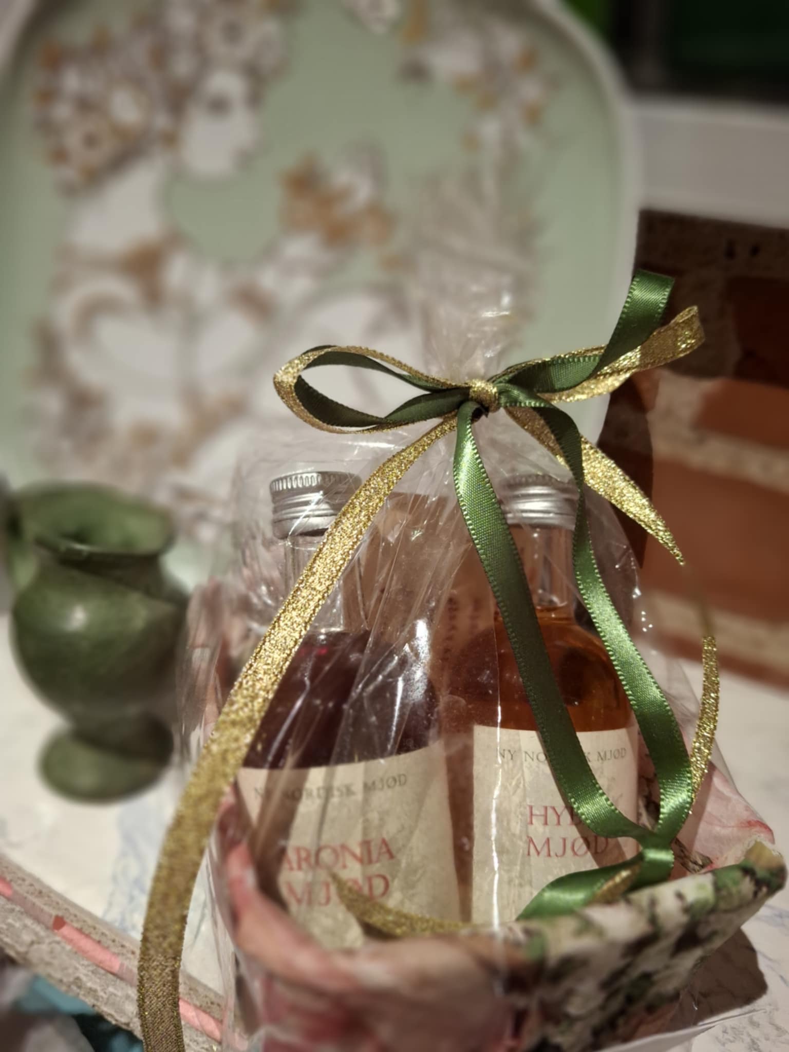 Flaskerne er smukt pakket i cellofan og bundet med gavebånd – lige til at give videre.
