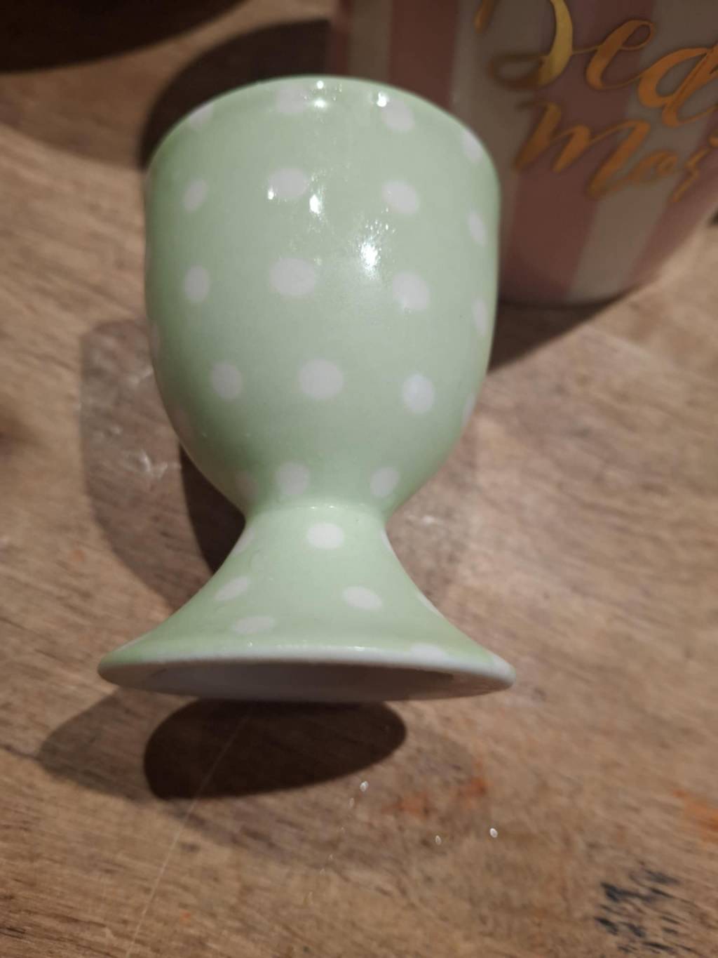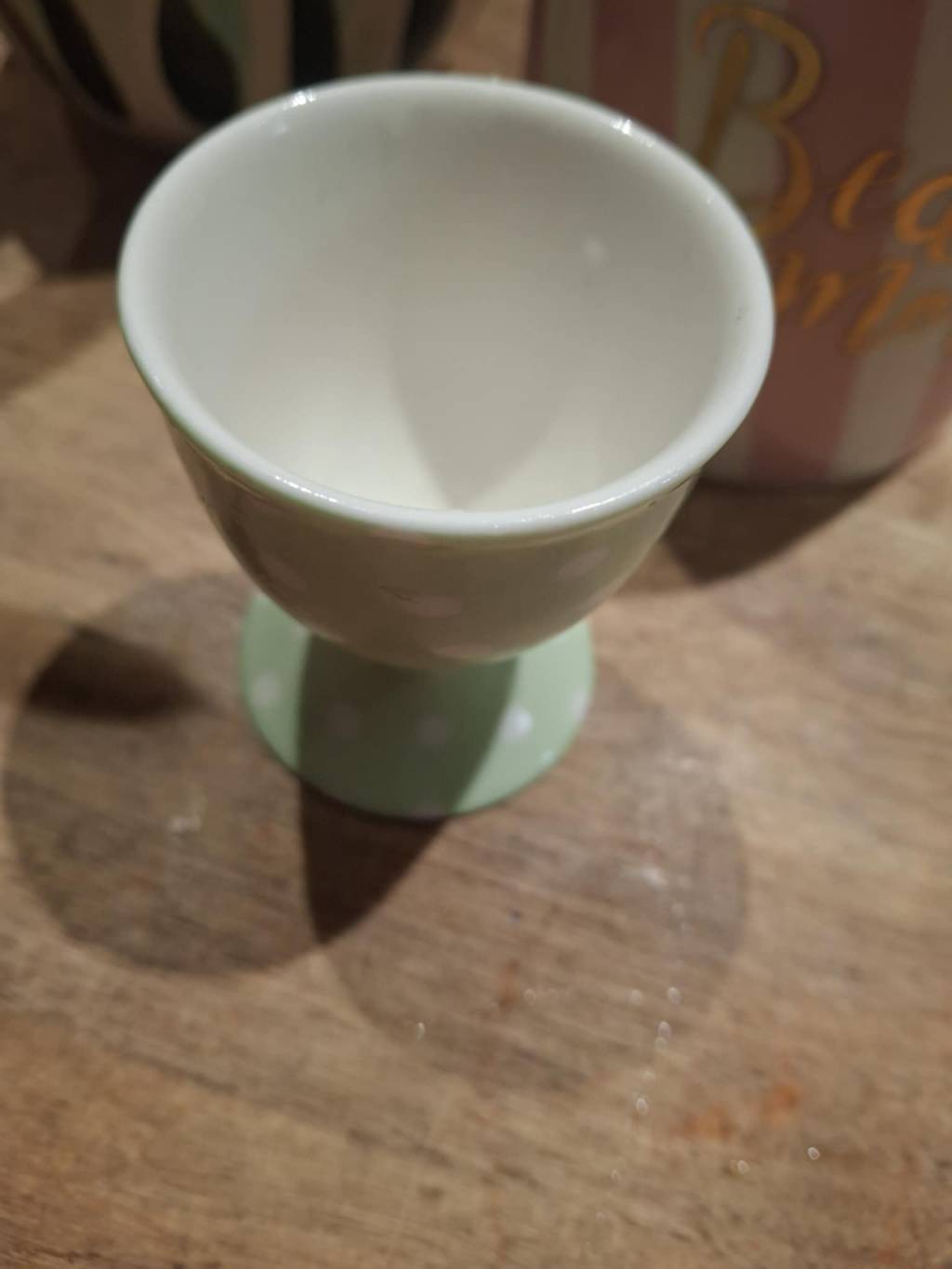 Dette søde æggebæger fra GreenGate bringer et strejf af charme til morgenbordet. Den grønne farve med hvide prikker emmer af nostalgi og hygge 🌸.
