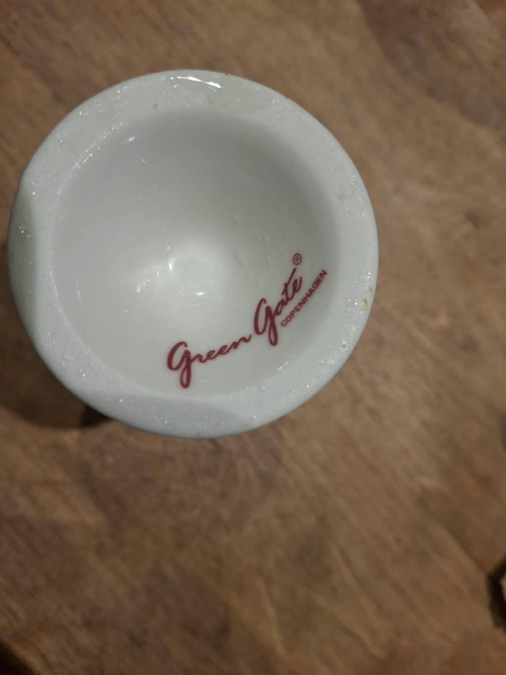 Æggebægeret er fremstillet i porcelæn og bærer tydeligt GreenGate’s klassiske design. Den kurvede form og det smukke mønster gør det både funktionelt og dekorativt. Den lette patina på undersiden vidner om et kærligt brug, men det gør kun historien bag endnu mere hjertevarm.