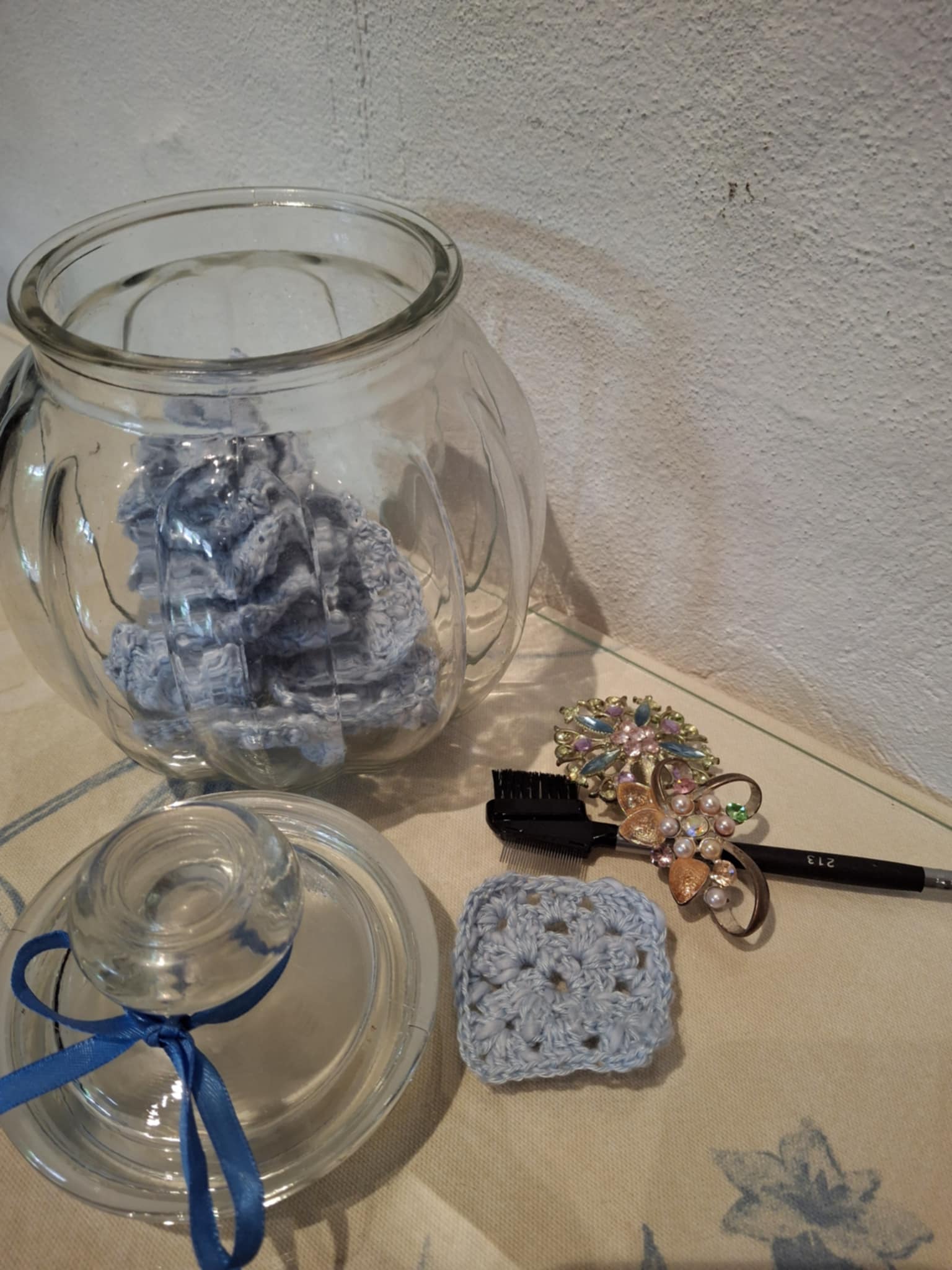 I dette sæt får du et dekorativt glas fyldt med bløde, håndhæklet bomuldsrondeller – klar til at stå fremme på badeværelset.