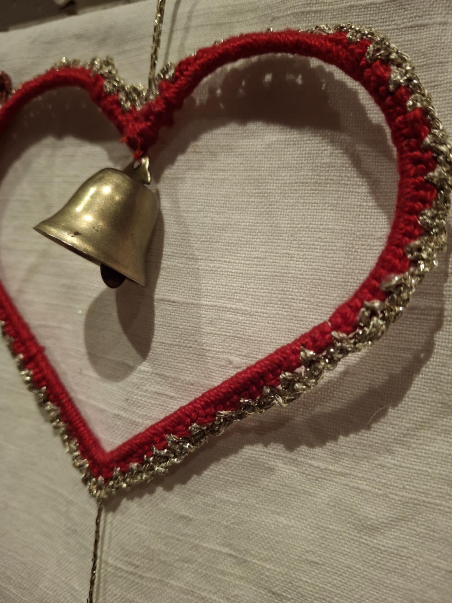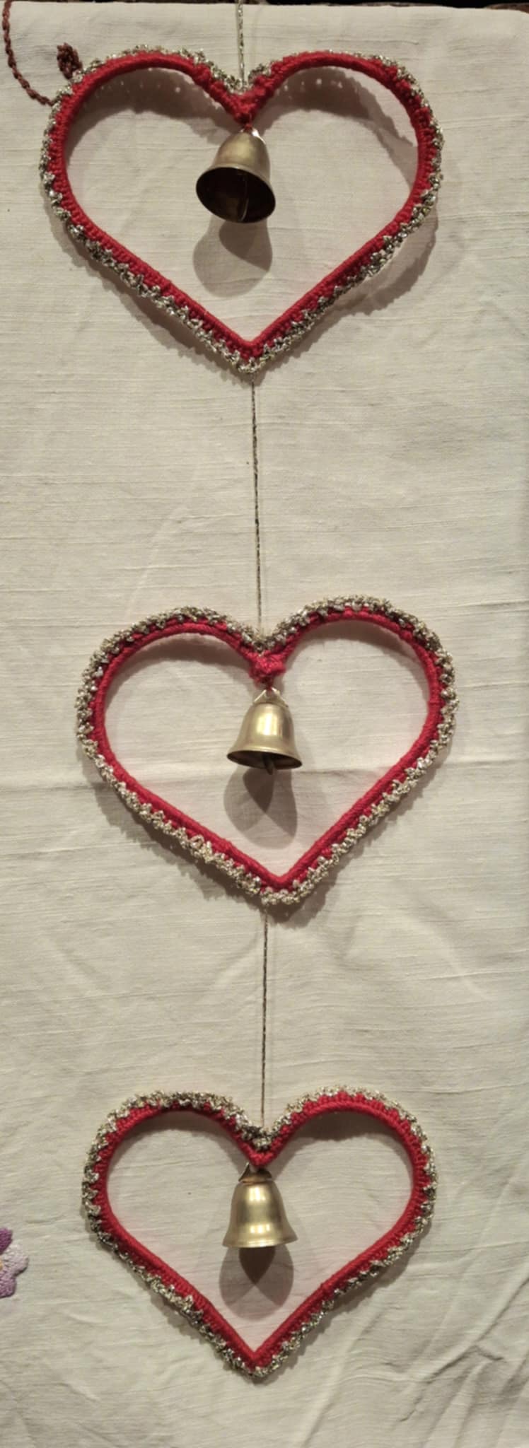 Dette fine juleophæng med 3 hæklet hjerter er lavet i smukt rødt garn med en sirlig guldkant, der glitrer lige nok til, at det føles højtideligt – uden at blive prangende. I hvert hjerte sidder der en lille messingklokke, som giver et diskret, hyggeligt kling, når ophænget bevæger sig.