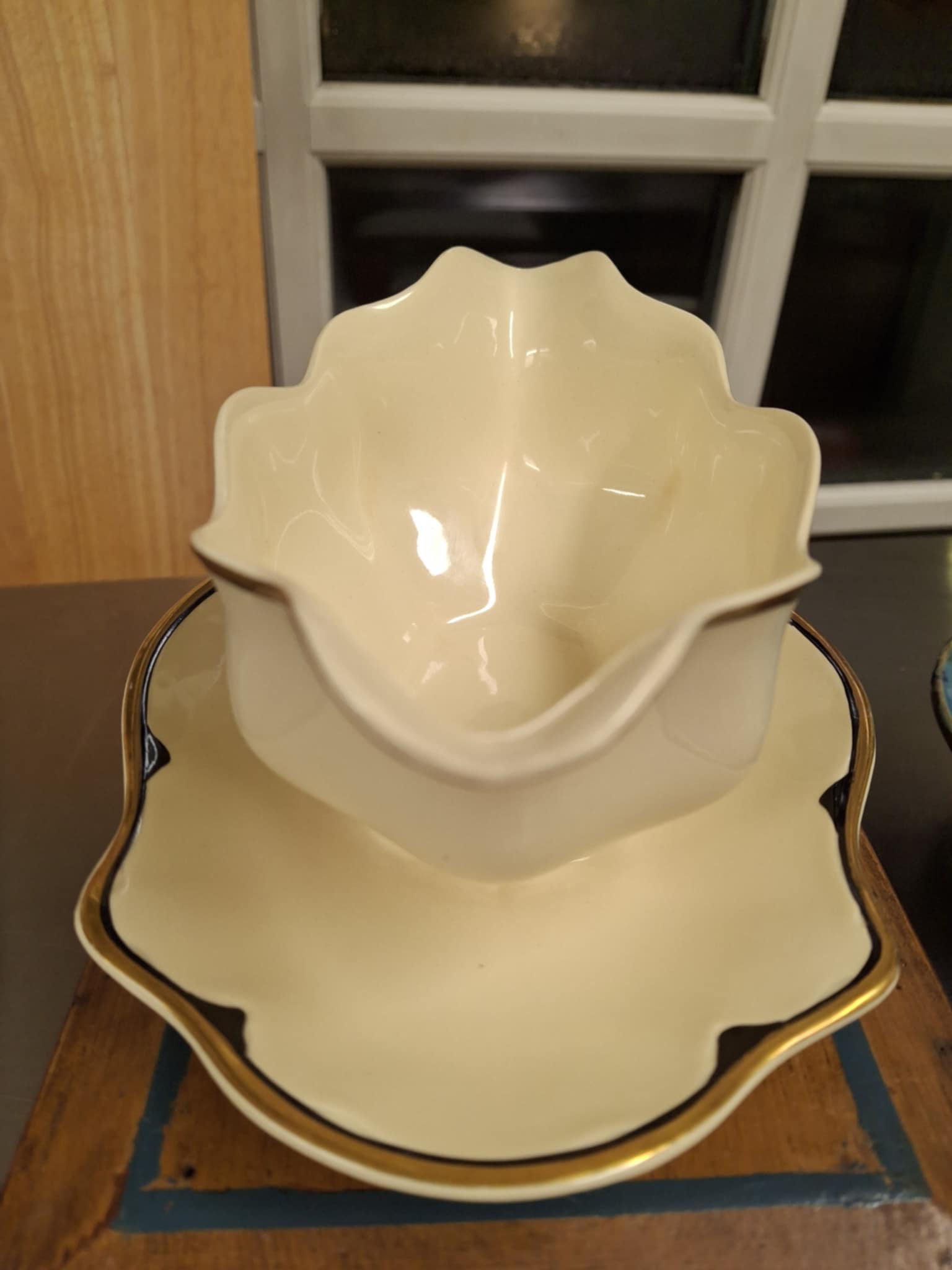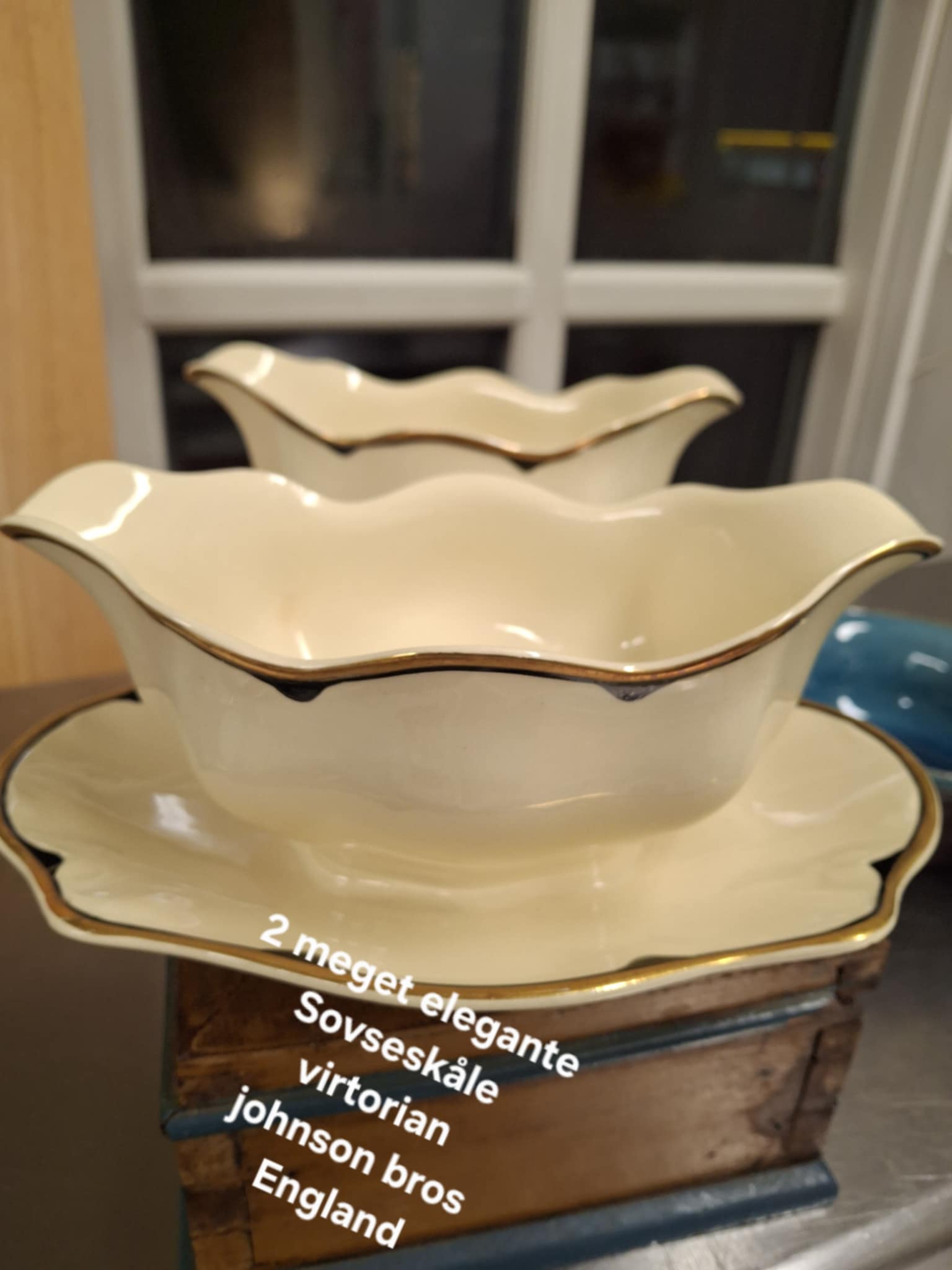 De cremefarvede sovseskåle prydes af en smuk guldkant og venter bare på at berige dit middagsbord med et strejf af nostalgi.