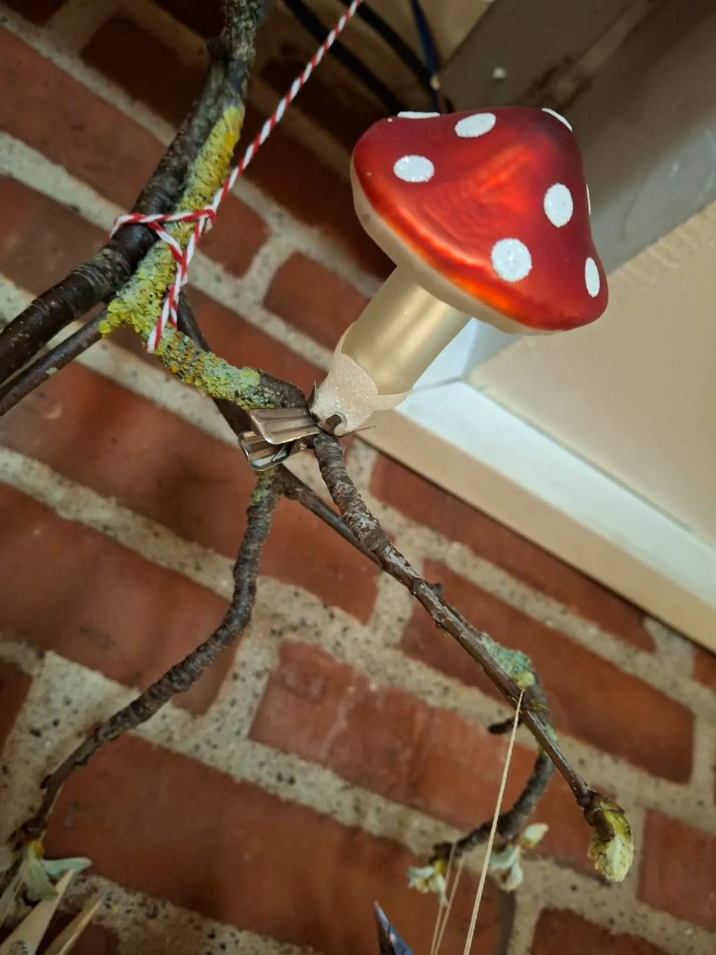 Skab julestemning med disse charmerende glasfluesvampe i rødt og hvidt. Perfekt til pynt på grene eller juletræet. ✨🎄