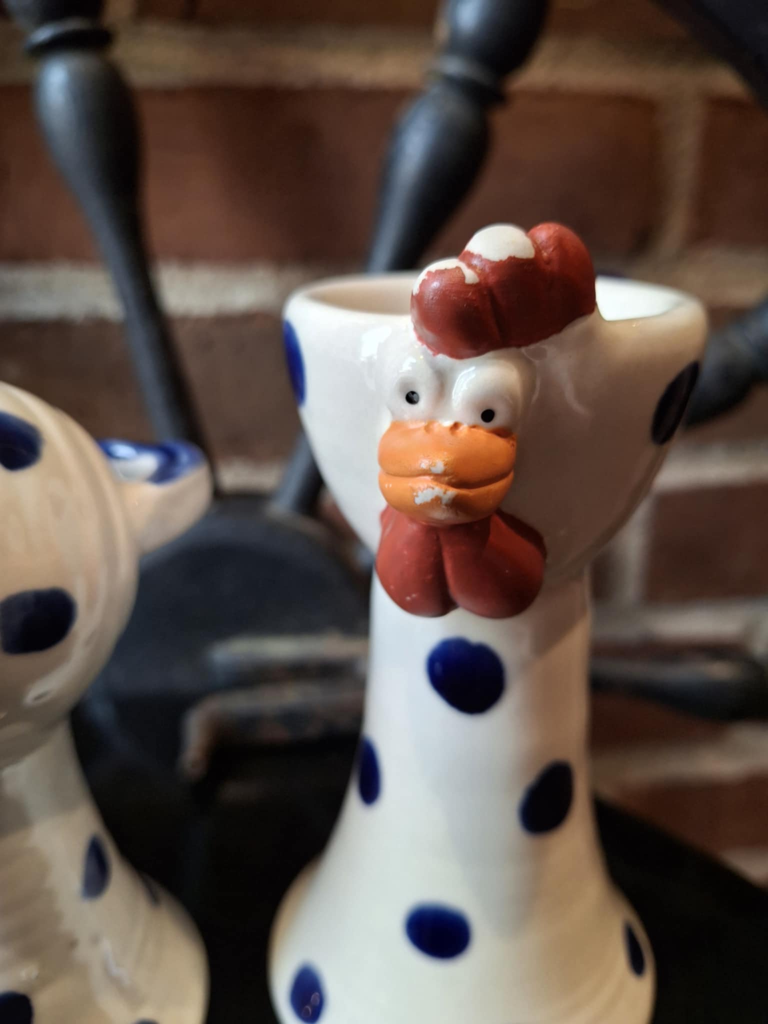 De håndmalede detaljer med store øjne, røde kamme og prikmønster giver figurerne et humoristisk og hyggeligt udtryk, der passer perfekt i både køkkenet, sommerhuset eller som pynt på påskebordet.