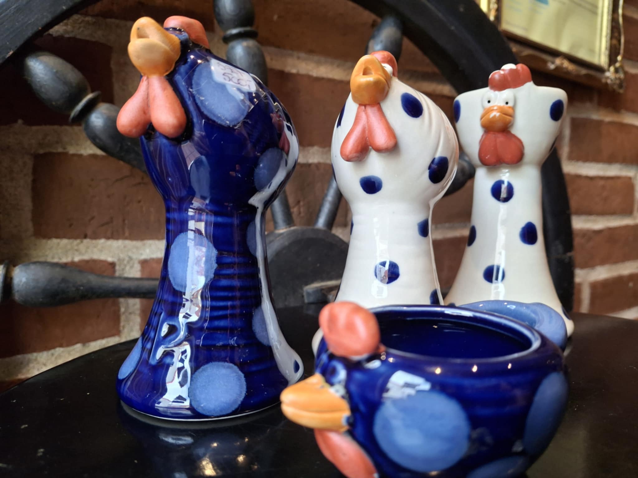 Sæt med 4 charmerende keramikfigurer formet som høns – to i hvid med blå prikker og én i mørkeblå med lyse prikker. Hertil kommer en lille matchende skål/holder i samme stil.