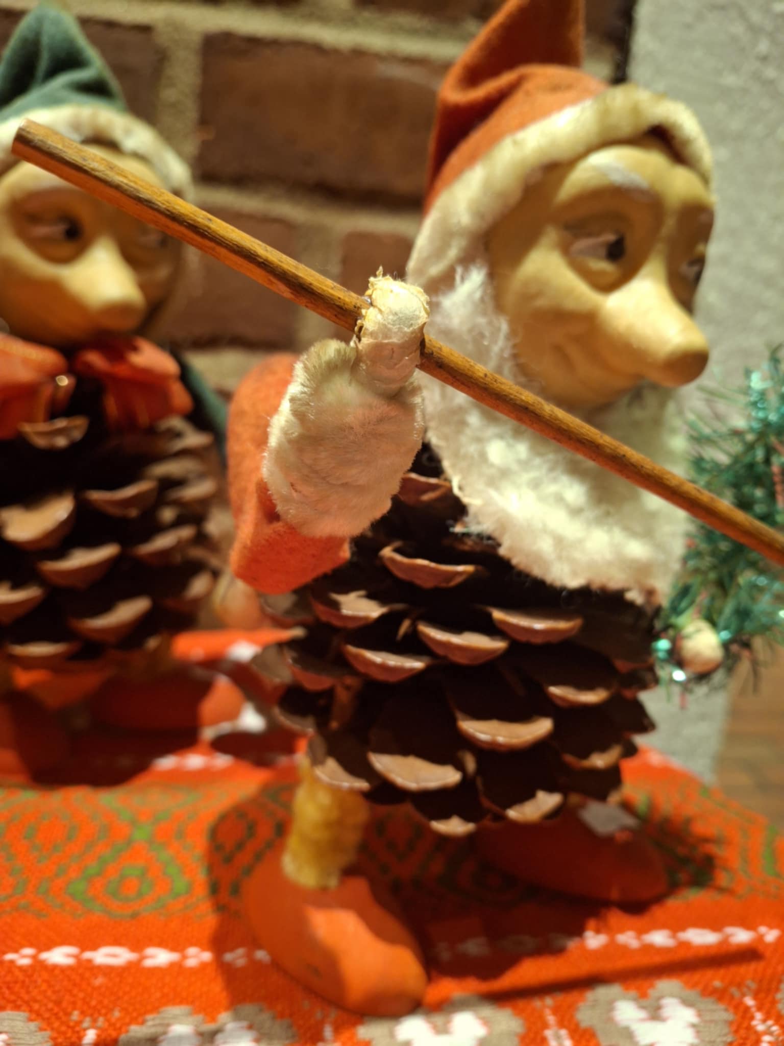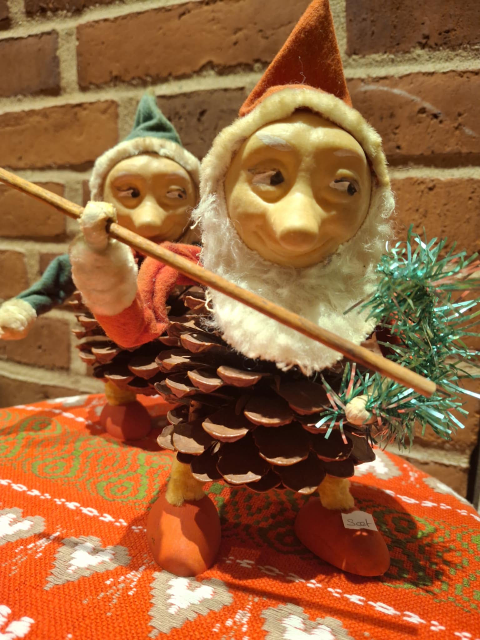 Sættet består af to nisser, hver lavet med en stor, smuk fyrrekogle som krop – og med personlighed fra top til tå: