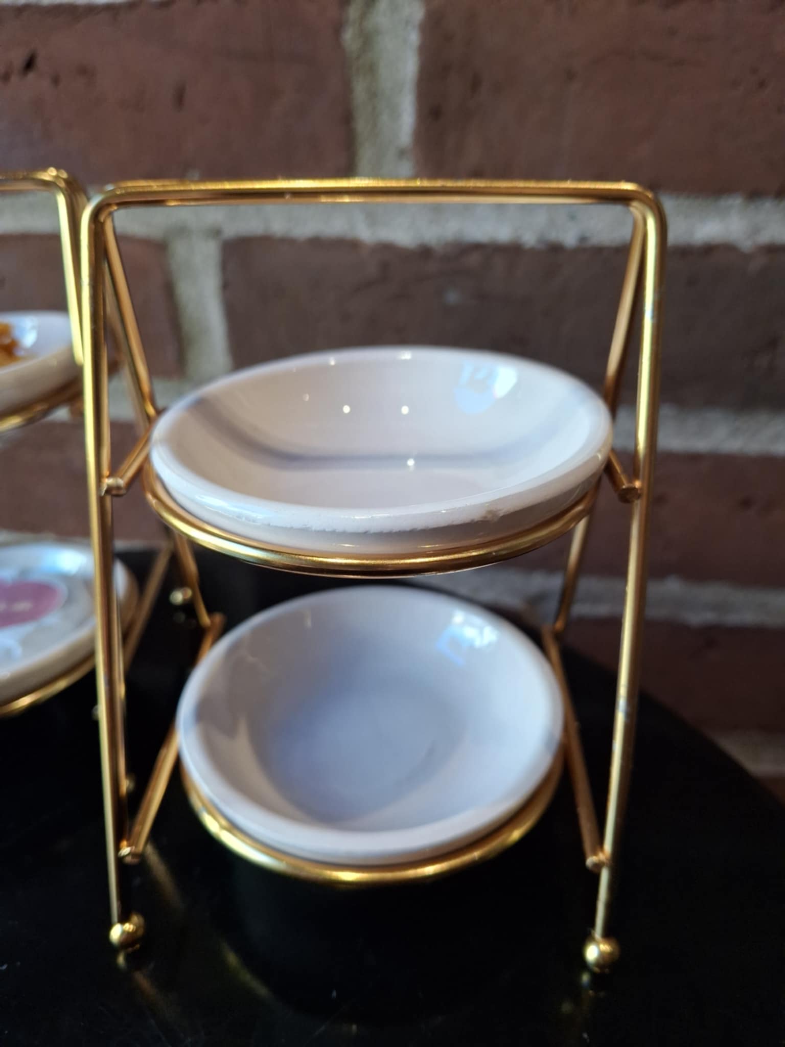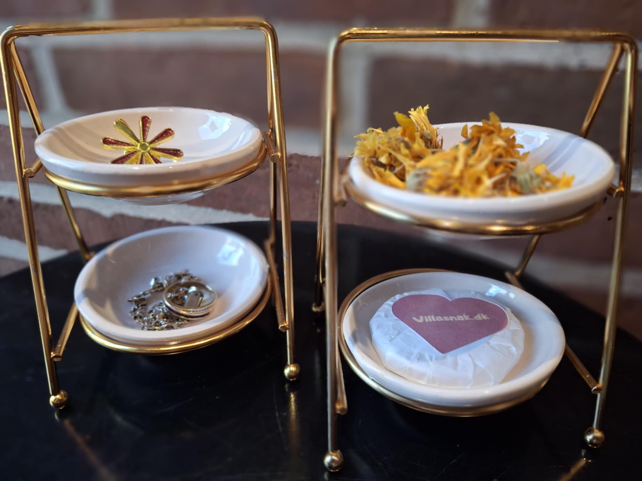 Disse to-etagers porcelænsstativer med gyldent stel er som skabt til de små hverdagsglæder – en smuk måde at fremvise dine yndlingssmykker, tørrede blomster eller en lille sæbe fra Villasnak.dk 🌿💍
