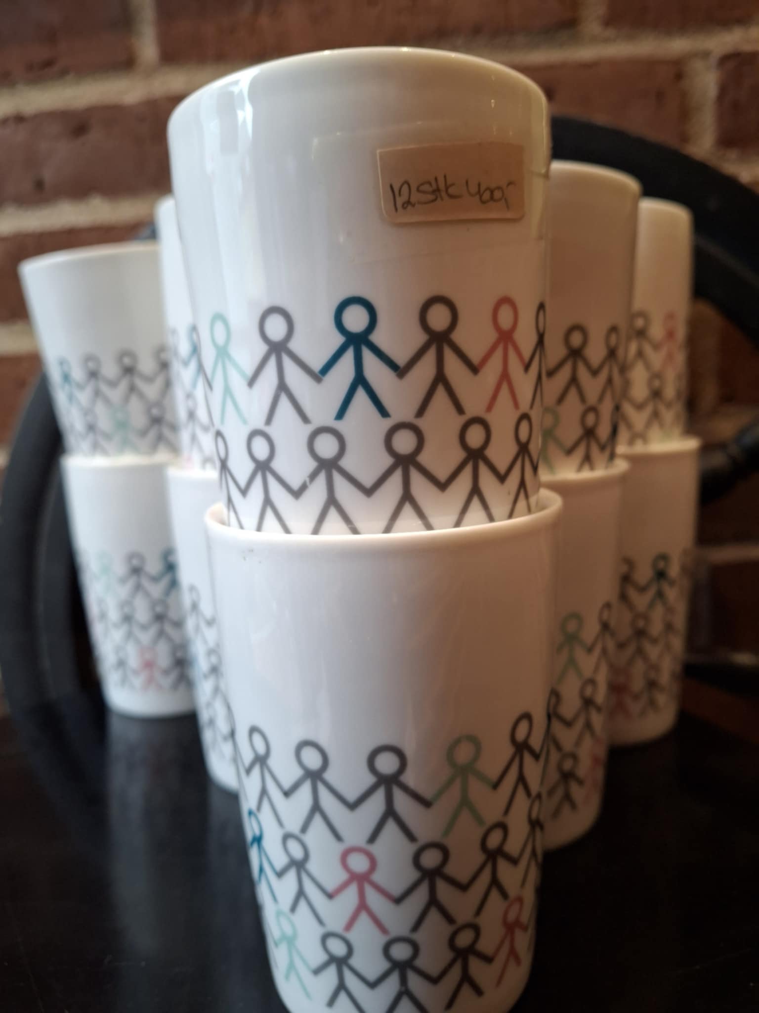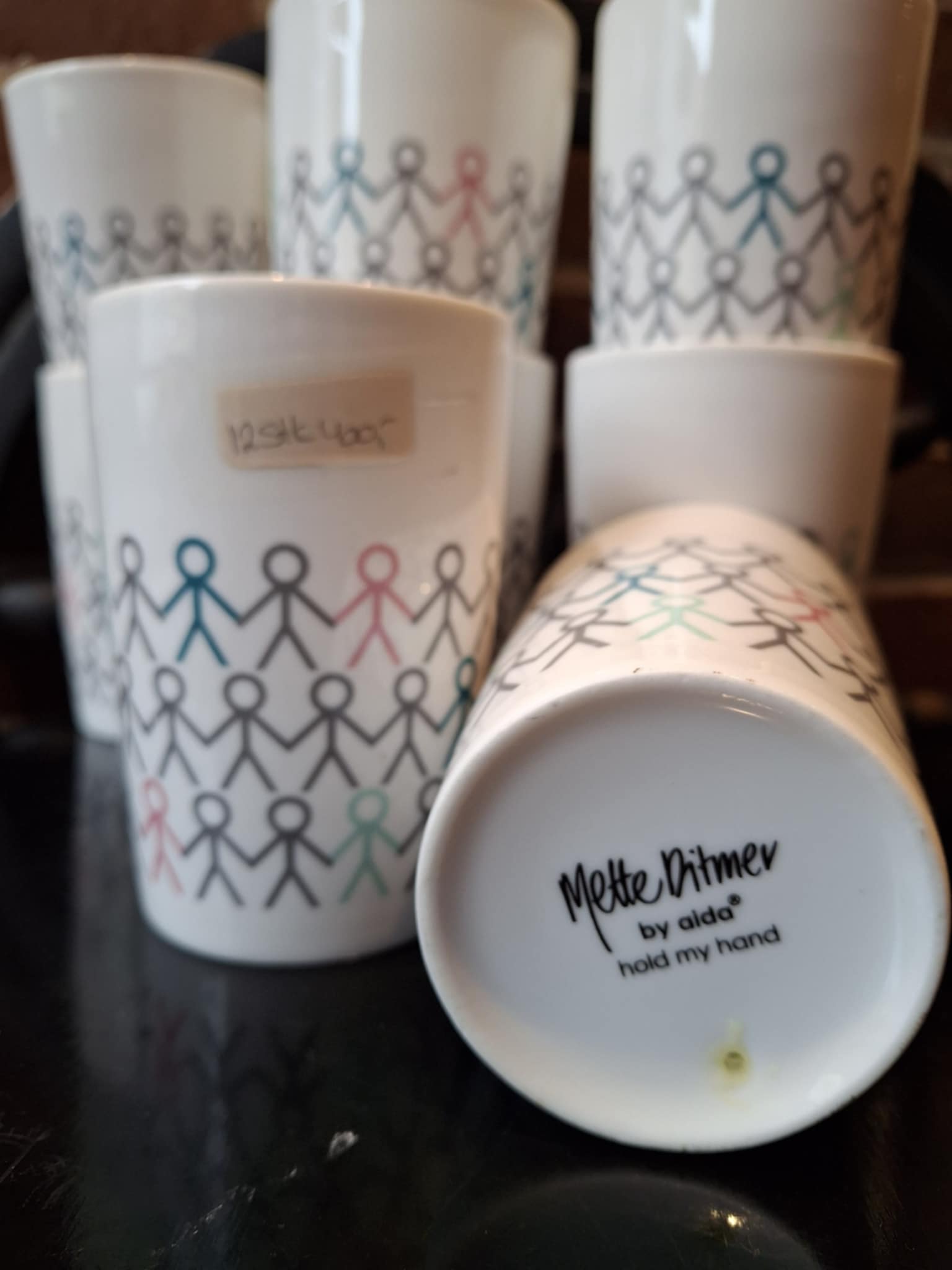 Et sæt på hele 12 porcelænskopper fra serien Hold My Hand, designet af Mette Ditmer for Aida. Serien er kendt for sit enkle og grafiske udtryk, hvor små farverige stregmennesker holder hinanden i hånden som symbol på fællesskab, samhørighed og varme.