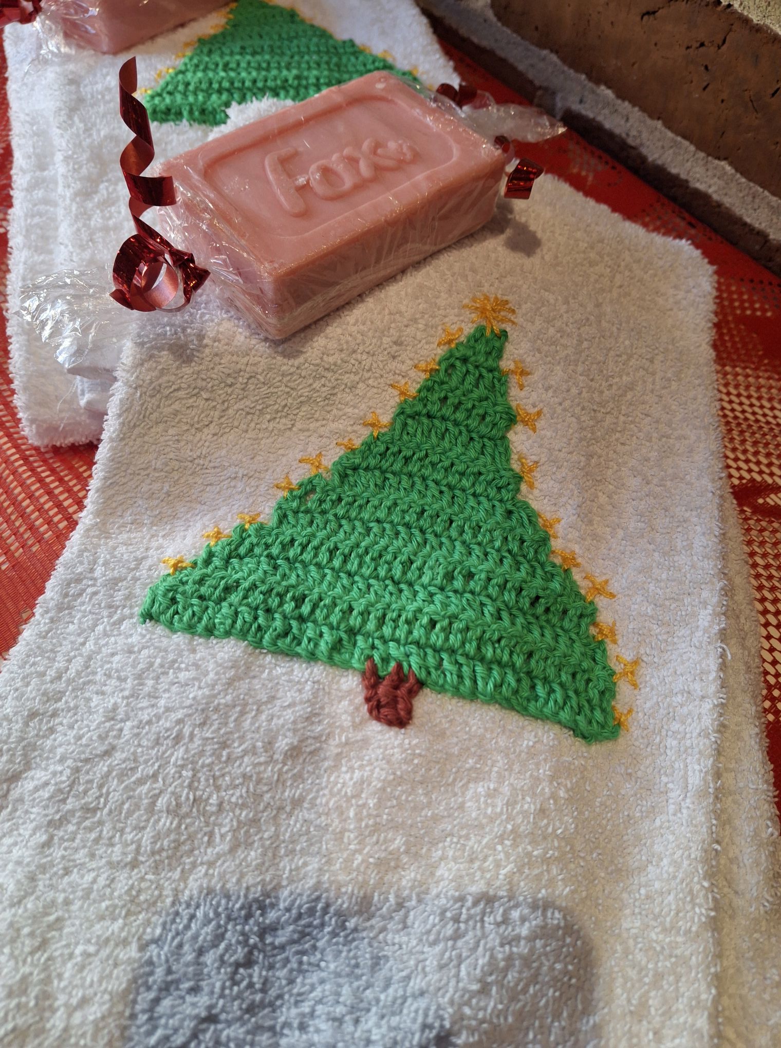 Midt på håndklædet har Mormor hæklet et charmerende juletræ i grønt bomuldsgarn, pyntet med små stjerne-sting hele vejen op til træspidsen. Det er sådan et håndklæde, som både “tørrer og tørrer”, som hun siger… og som får selv det travleste gæstetoilet til at dufte lidt af december.