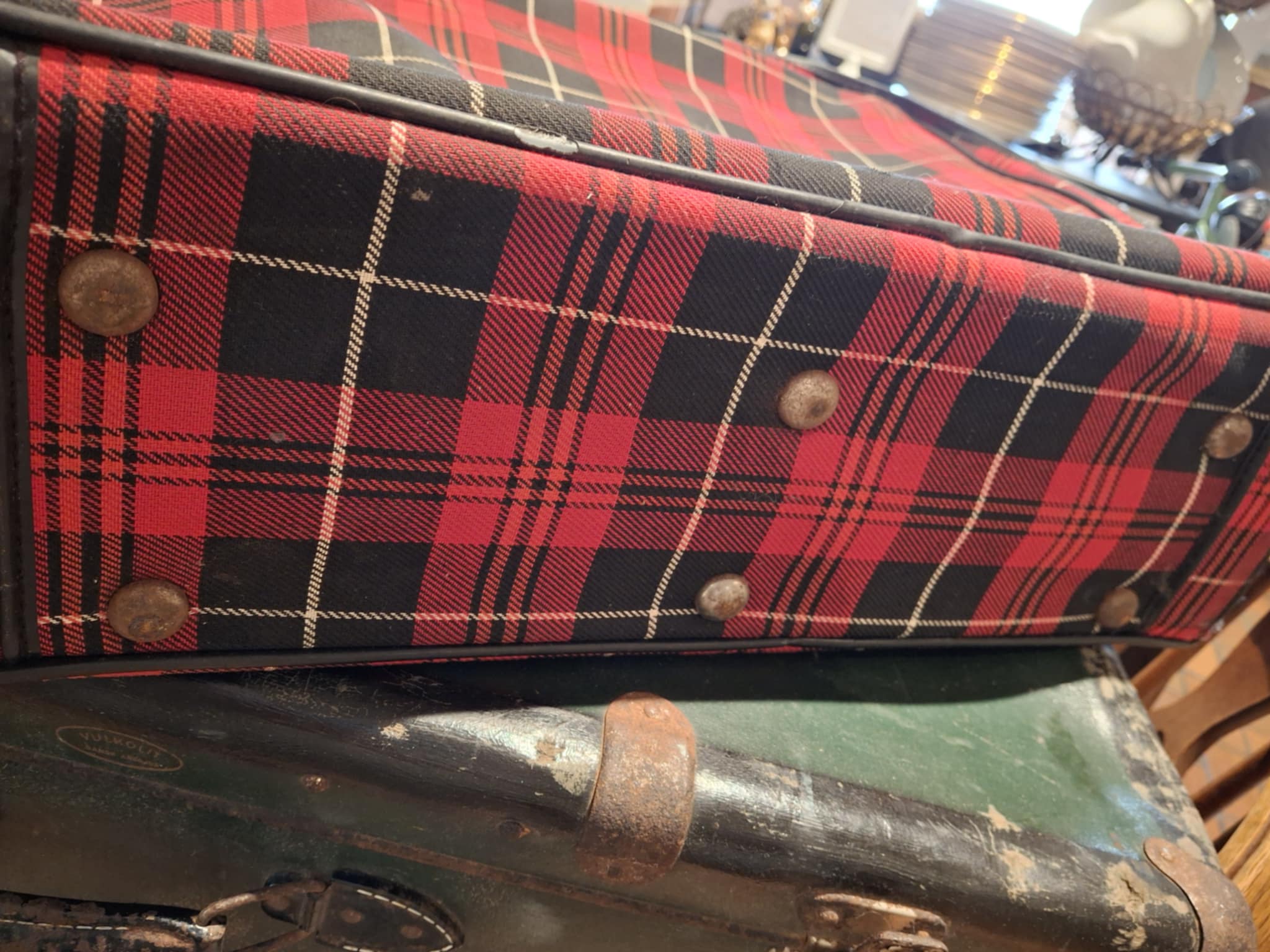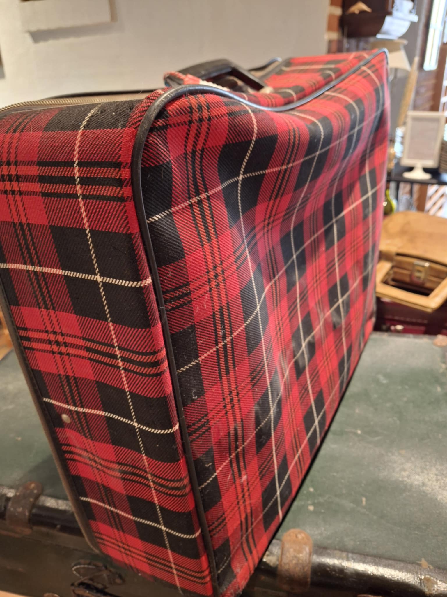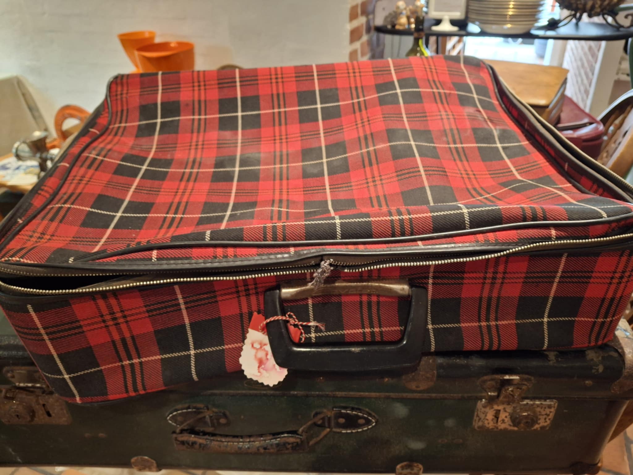 Denne rødrutede kuffert er ren tidsrejse i stof og lynlås. Den bringer minder om busture, campingferier og togbilletter i pap, hvor kufferten blev pakket med hjemmesmurte madpakker og bedstefars ternede skjorter.