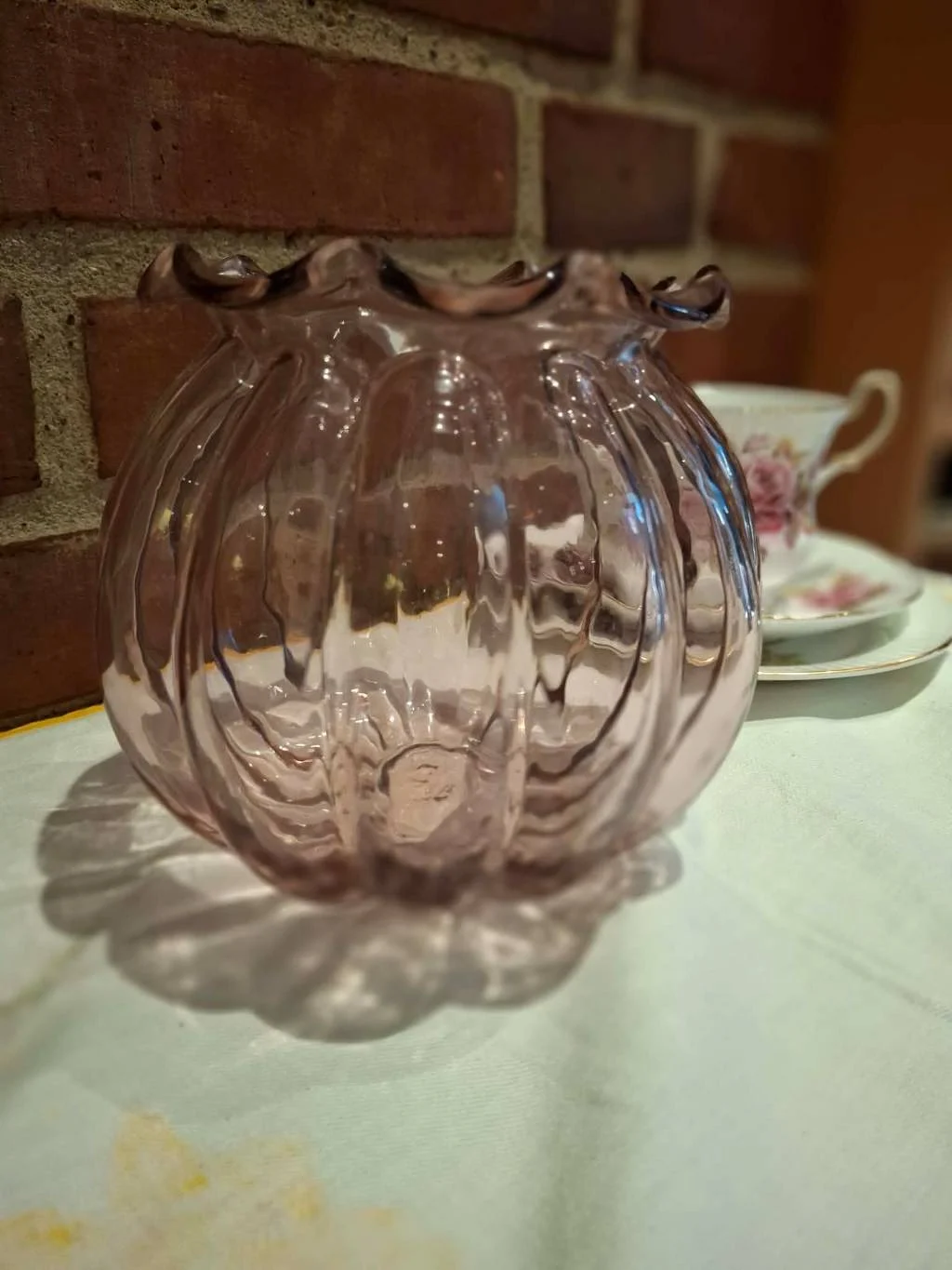 Denne charmerende rosa glasvase bringer et strejf af nostalgi og hygge til ethvert rum. Med sin bløde farve og dekorative bølgende kant er den både elegant og unik.