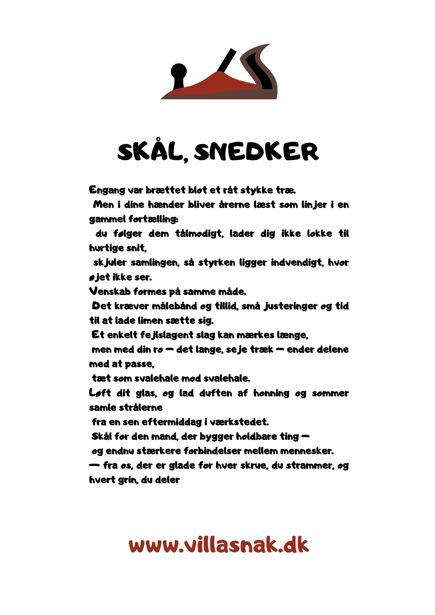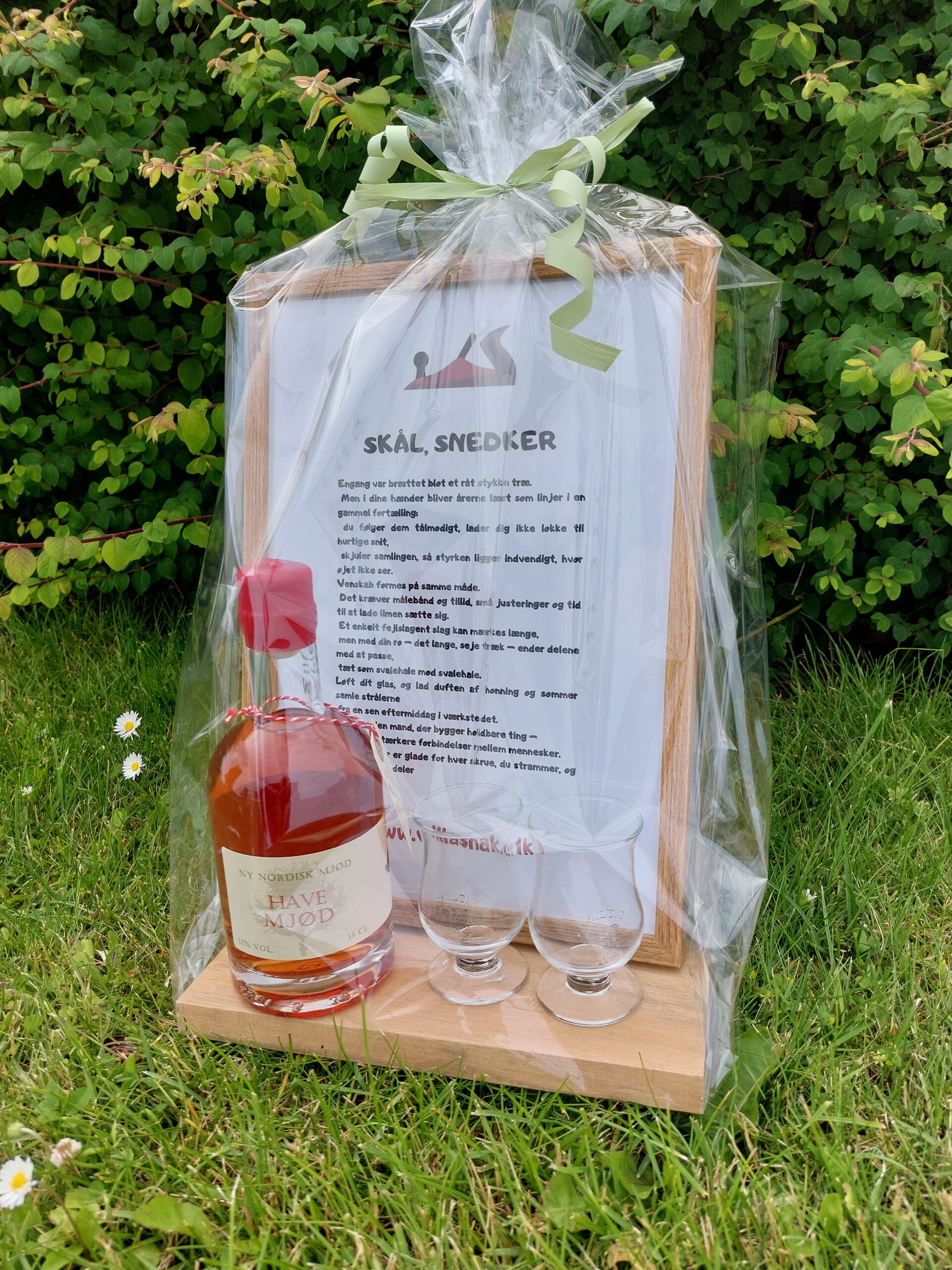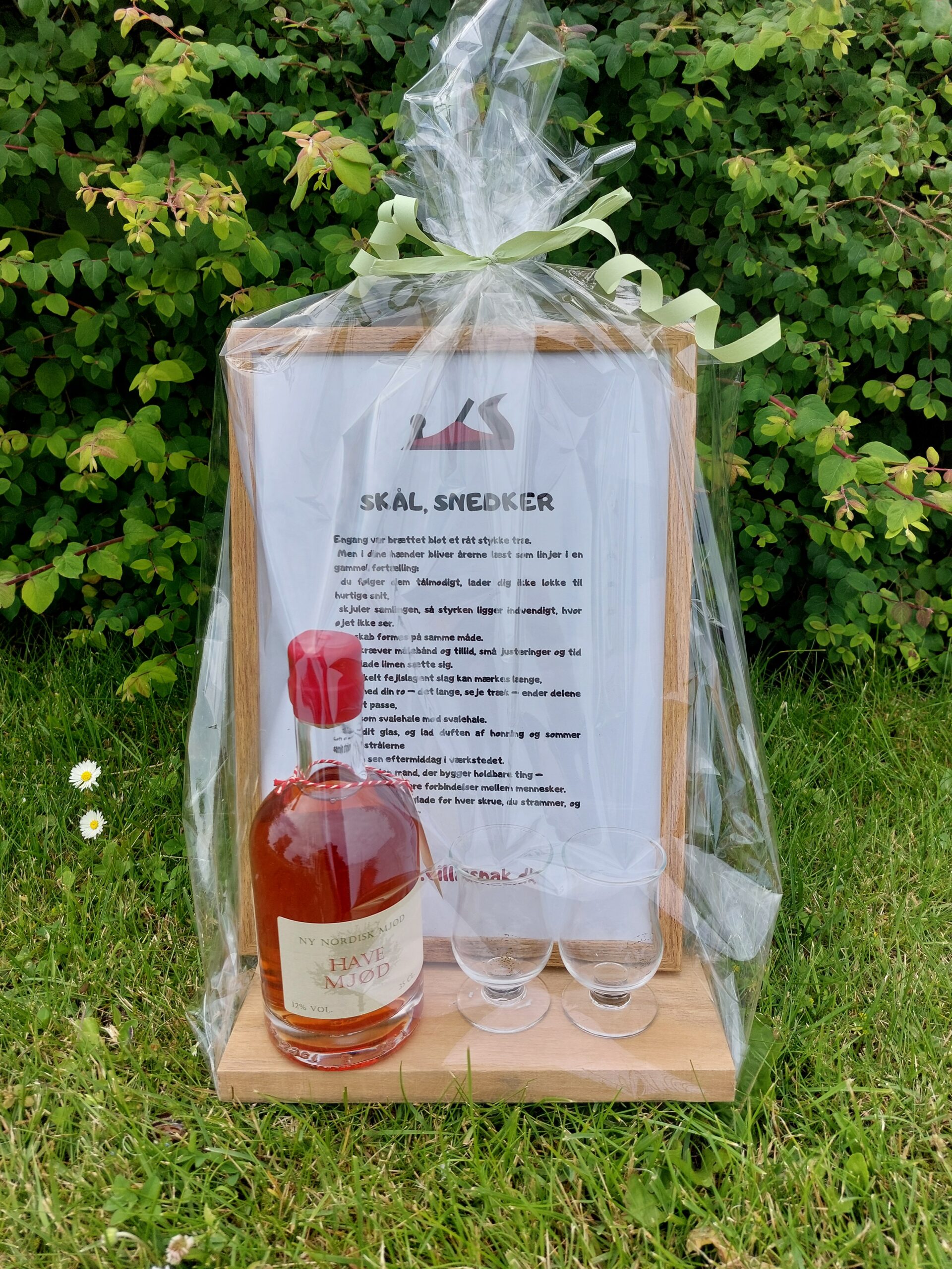 Når de ravgyldne dråber fanger lyset, og ordene i rammen begynder at vibrere af varme, bliver Skål, Snedker mere end en gave – det er et håndgribeligt “tak” for alt det, han er: den rolige skaber, den solide klippe, den mand der holder sammen på både træ og mennesker.