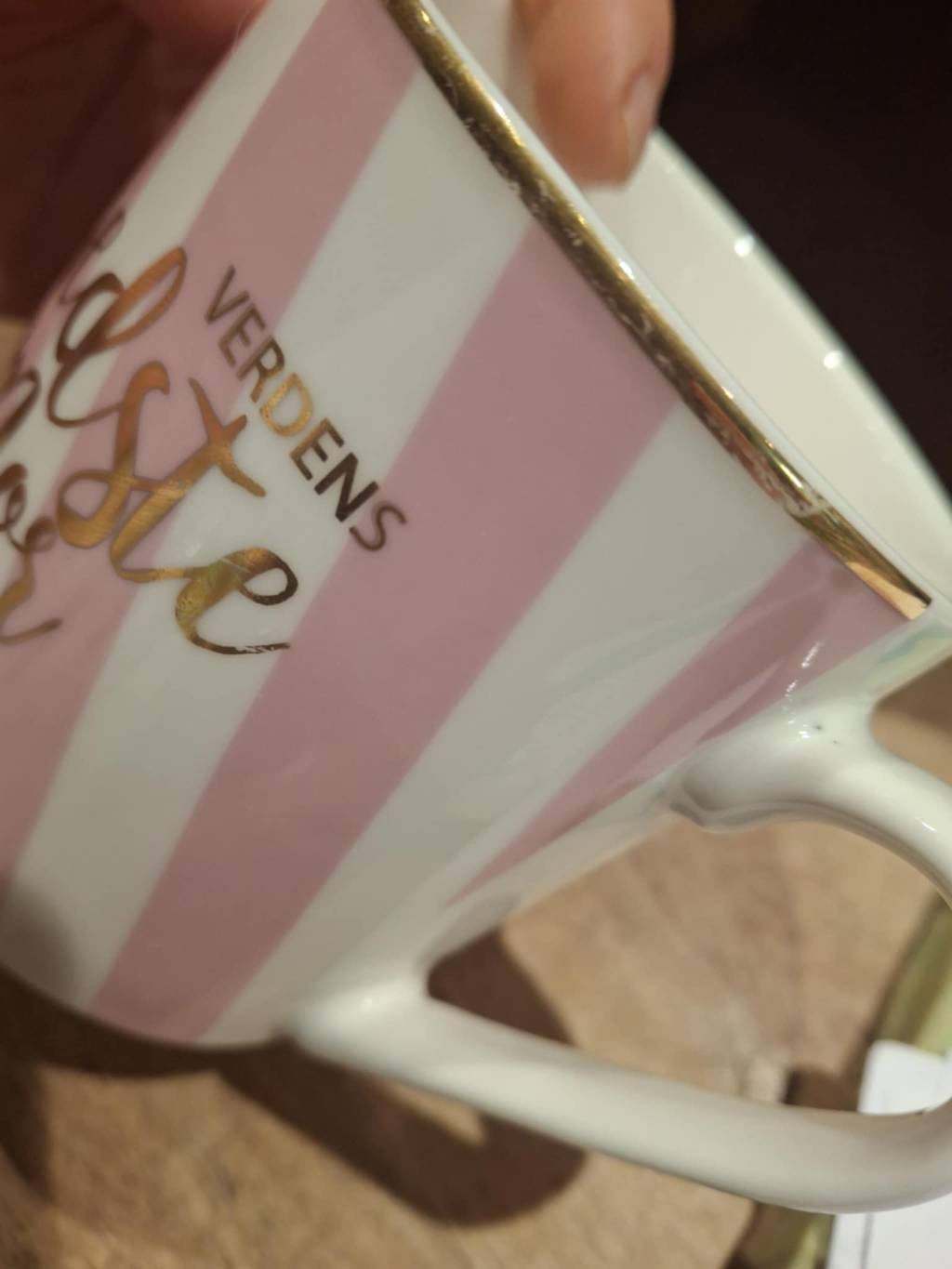 Dette yndige porcelænskrus fra GreenGate er ikke bare en praktisk kaffekop – det er en kærlighedserklæring i sig selv. Med sin fine tekst ‘Verdens Bedste Mor’ og elegante lyserøde striber giver det enhver kaffepause et strejf af varme og personlighed. 💕