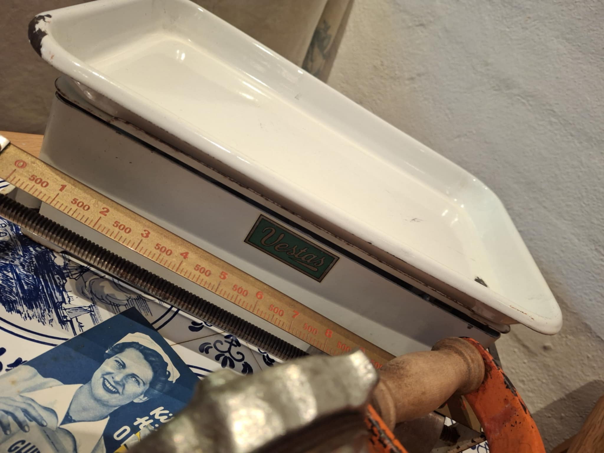 Den kan stadig bruges til bagning, men den største værdi ligger i dens stemning: en vægt, der har set mange deje, kager og små mirakler i køkkenet.