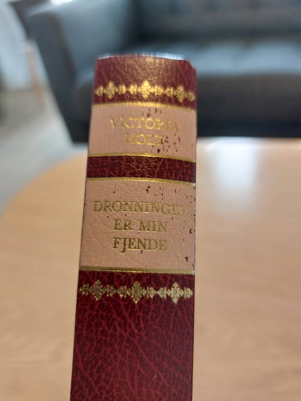 Victoria Holts klassiker ‘Dronningen er min Fjende’ med smuk rød indbinding og guldtryk. En charmerende tilføjelse til bogreolen. 🌿📖✨