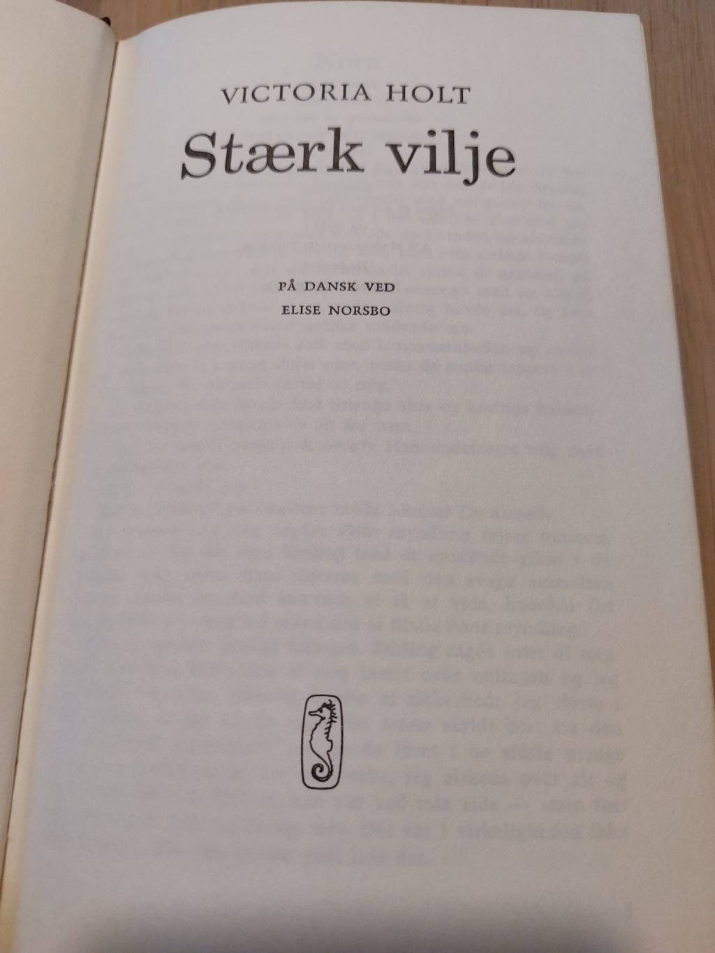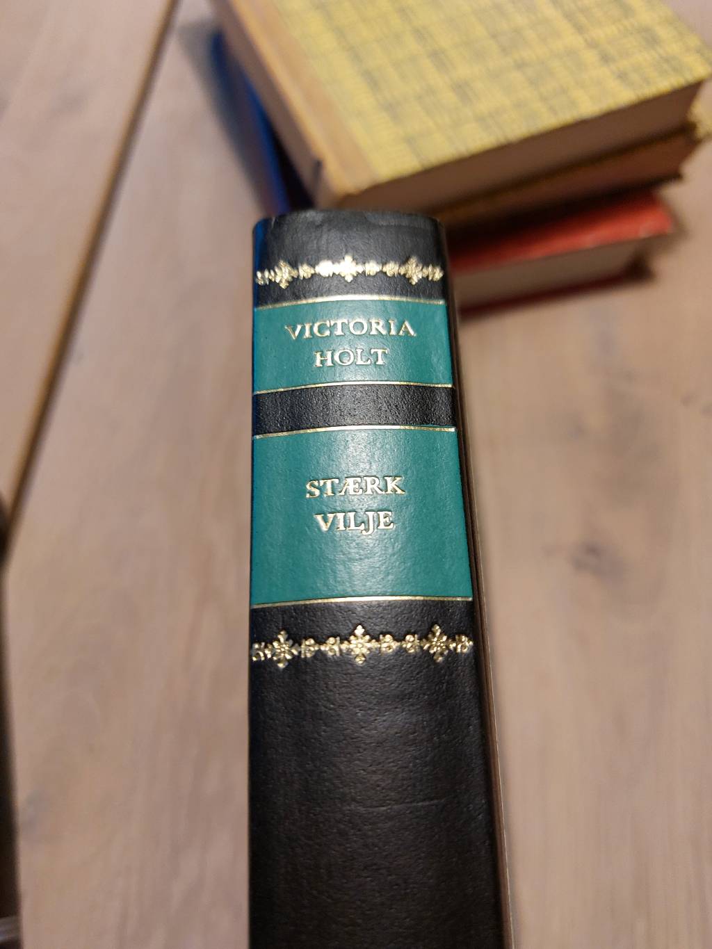Ah, her er en rigtig skat til bogreolen – Victoria Holts “Stærk vilje”. Allerede bogens ryg lokker med sin dybsorte farve, prydet af to smukke, turkise felter med forfatterens navn og titlen trykt med elegante guldbogstaver. Rundt om ser vi fine gyldne ornamenter, der giver bogen et næsten royalt udtryk. Den er simpelthen så fin og klar til at pynte i ethvert hjem! 👑