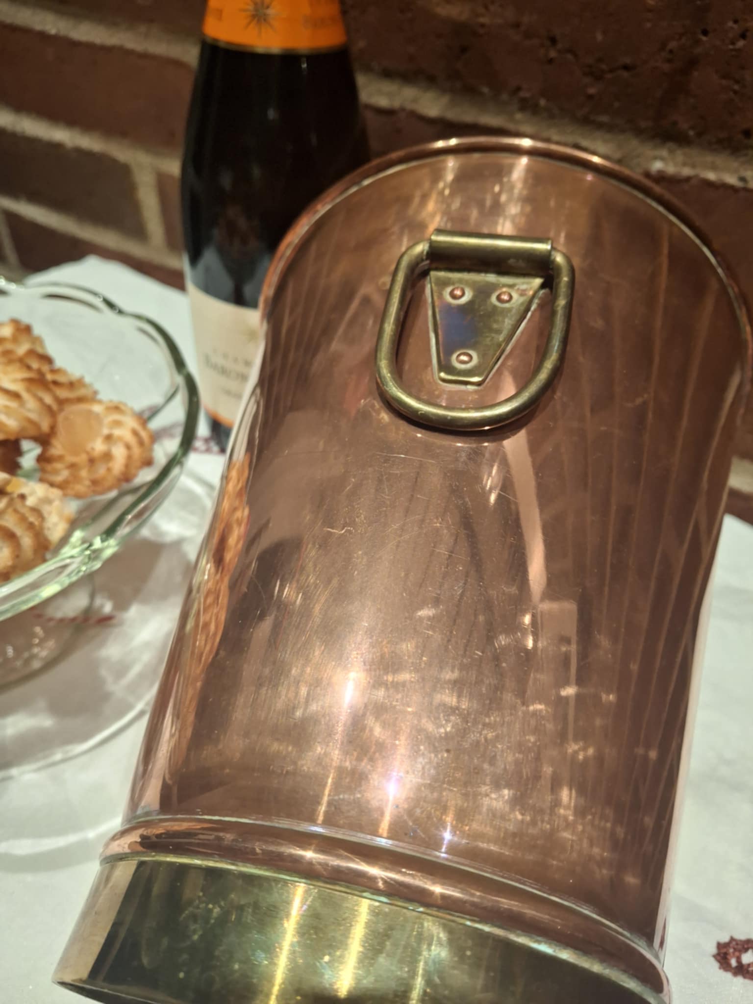 Køleren er lavet i kobber med messingdetaljer og praktiske ringhåndtag, så den både står flot og er nem at flytte.