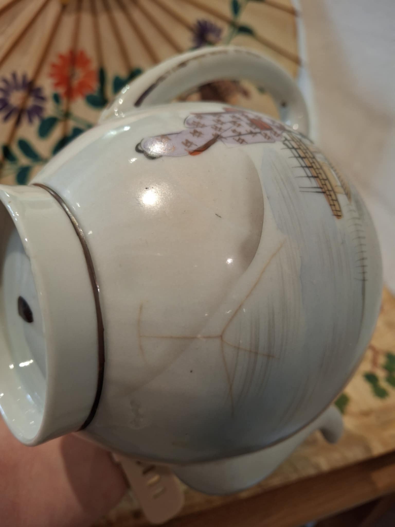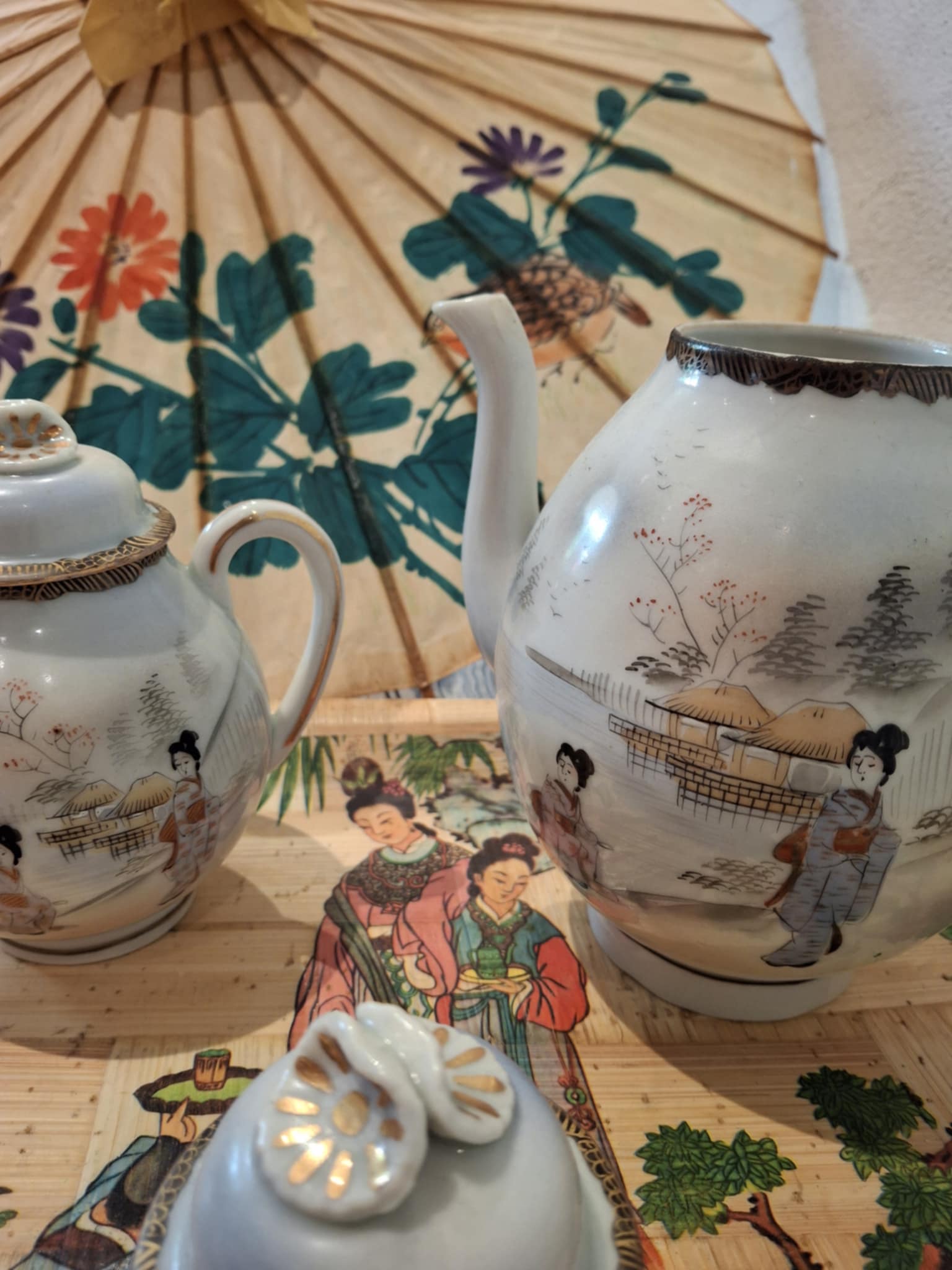 Smukt og dekorativt porcelænssæt fra Japan, håndmalet med klassiske motiver af geishaer og natur. Sættet rummer to kander med låg, dekoreret med guld- og perlemorsdetaljer.