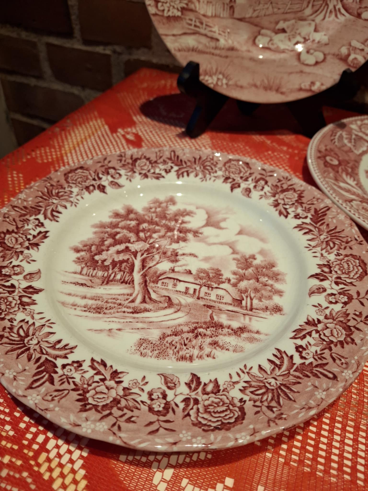 Denne smukke vintage-tallerken fra W.H. Grindley & Co., Staffordshire England er et lille stykke britisk porcelænshistorie. Serien Country Style er elsket for sit klassiske røde transfertryk, der viser et idyllisk landskab med bindingsværkshus, store gamle træer og en snoet landevej – præcis den slags motiv, der får Mormor til at sige:
