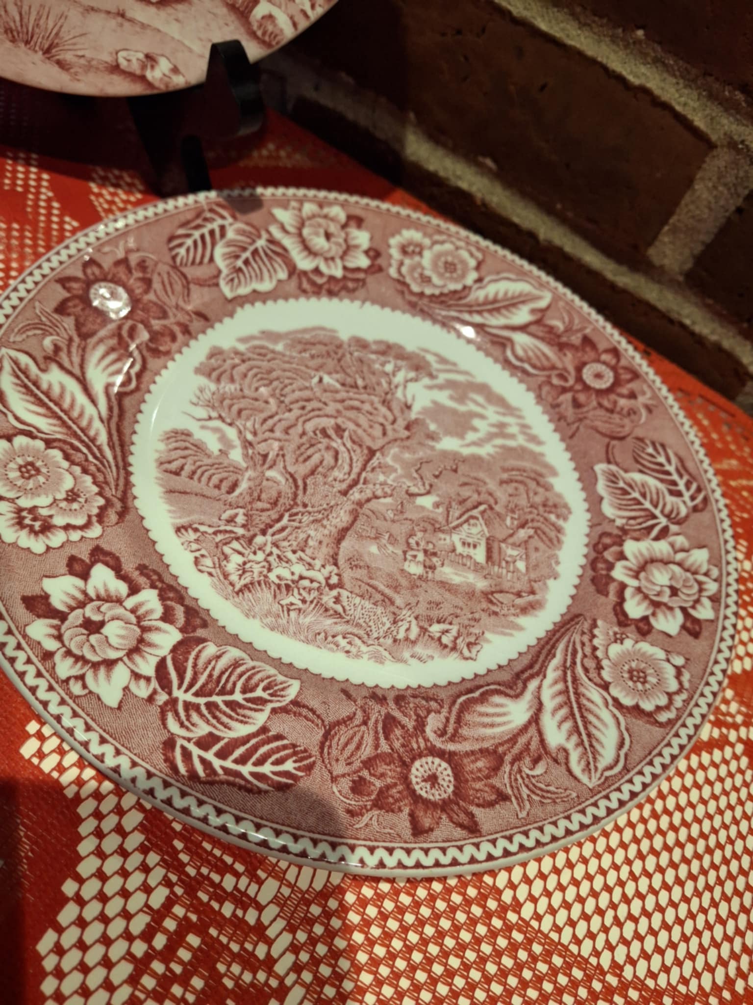 Motivet er klassisk engelsk landidyl: et lille hus omgivet af træer, bløde bakker og en stemning af stille søndage, hvor tiden går lidt langsommere. Den varme, røde transfer-dekoration løber som en blomstrende bort hele vejen rundt i kanten og indrammer scenen midt på tallerkenen – lige sådan én, Mormor ville have stillet forrest i vitrinen.